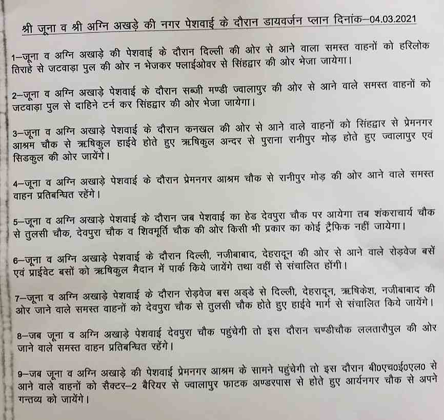 हरिद्वार। श्री पंच दशनाम जूना अखाड़ा श्री पंच दशनाम आह्वान अखाड़ा श्री पंच अग्नि अखाड़ा की पेशवाई 4 मार्च को 11 बजे पांडे वाला ज्वालापुर से गुघाल रोड, इंद्रपुरी तिराह , नीलखुदाना मोहल्ले, कोतवाली ज्वालापुर, चौक बाजार, जामा मस्जिद, कटहरा बाजार, रेल चौकी से ऊंचा पुल होते हुए आर्य नगर चौक, चंद्राचार्य चौक, ऋषिकुल रेलवे स्टेशन के सामने वाल्मीकि चौक होते हुए मायादेवी प्रांगण स्थित छावनी में प्रवेश करेगी। साथ ही स्थानीय निवासी व बाहर से आने वाले लोग प्रशासन द्वारा निर्धारित मार्ग का ही प्रयोग करें।
