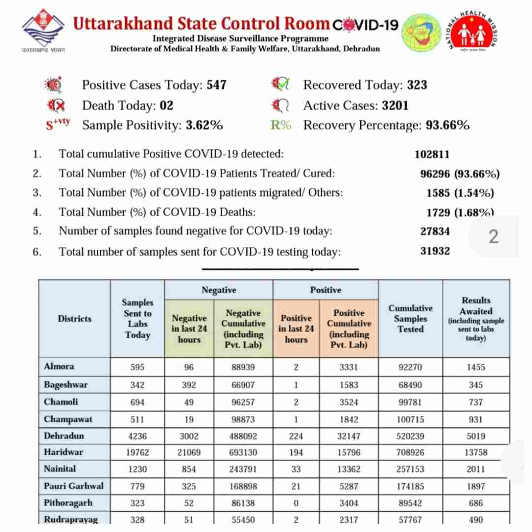 हरिद्वार। उत्तराखंड में कोरोना संक्रमण की रफ्तार बेकाबू होती जा रही है। उत्तराखंड स्टेट कंट्रोल रूम द्वारा जारी सूचना के अनुसार आज उत्तराखंड में कोरोना के 547 केस आए हैं जिनमें से केवल देहरादून में ही 224 और हरिद्वार में 194 पॉजिटिव केस हैं। यदि लोगों ने अभी भी कोरोना संक्रमण को रोकने के लिये बनाई गयी गाइड लाइन का पालन नहीं किया तो कोरोना संक्रमण की यह रफ्तार बहुत तेज गति से बढ़ती जाएगी जिसे काबू पाना शासन और प्रशासन के बस से बाहर हो जाएगा। इसलिये घर से तभी निकले जब बहुत जरूरी हो और नगर से निकलते समय मुहँ पर मास्क व दो गज की दूरी का पालन अवश्य करें।