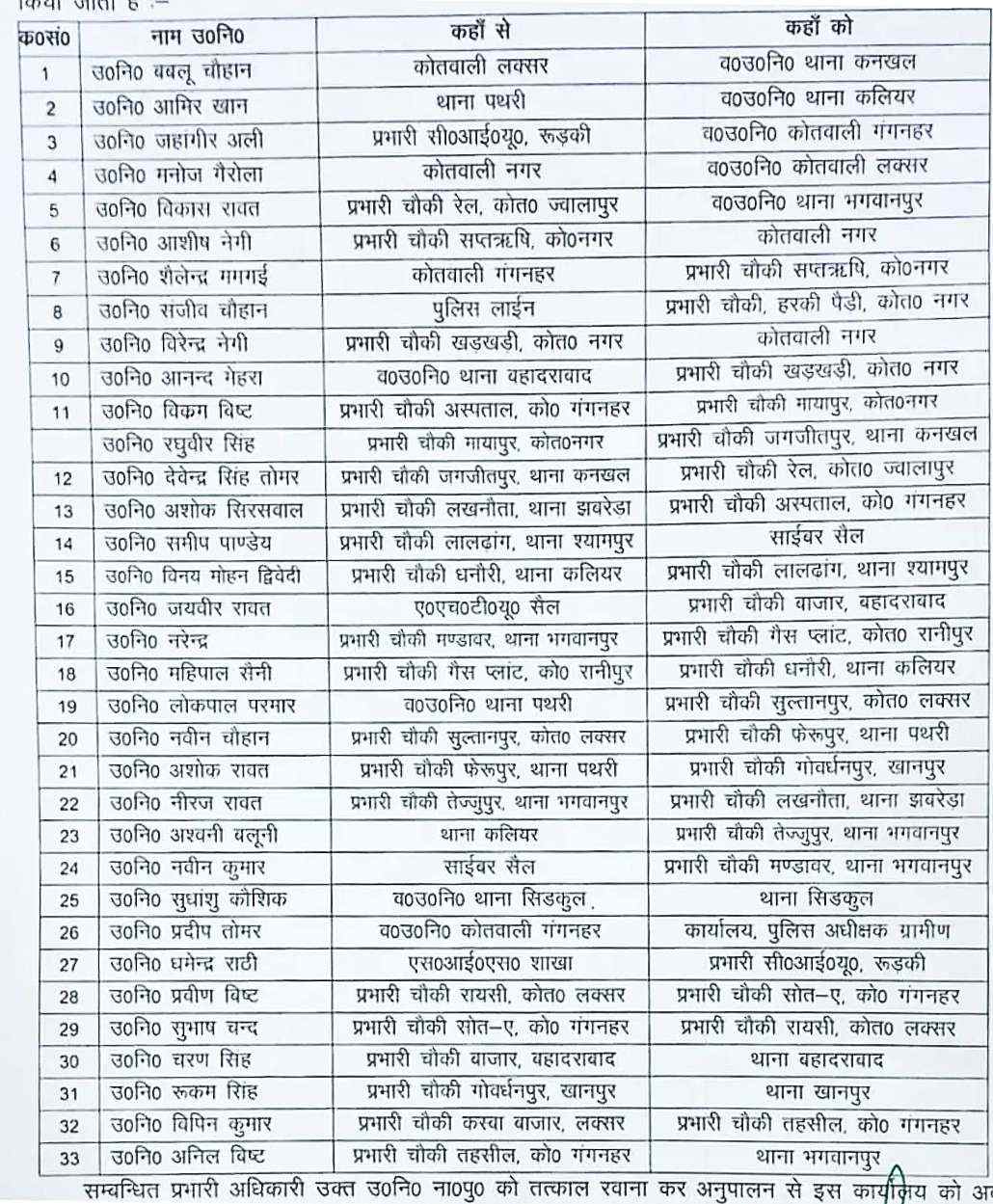 हरिद्वार। एसएसपी हरिद्वार ने देर रात 33 उप निरीक्षकों को इधर से उधर कर दिया है। जिसमें कई चौकी प्रभारी बदले गए हैं। अब देवेंद्र सिंह तोमर को विकास रावत के स्थान पर ज्वालापुर रेल चौकी का चार्ज दिया गया है और विकास रावत को थाना भगवानपुर भेजा गया है। देंखे तबादला सूची