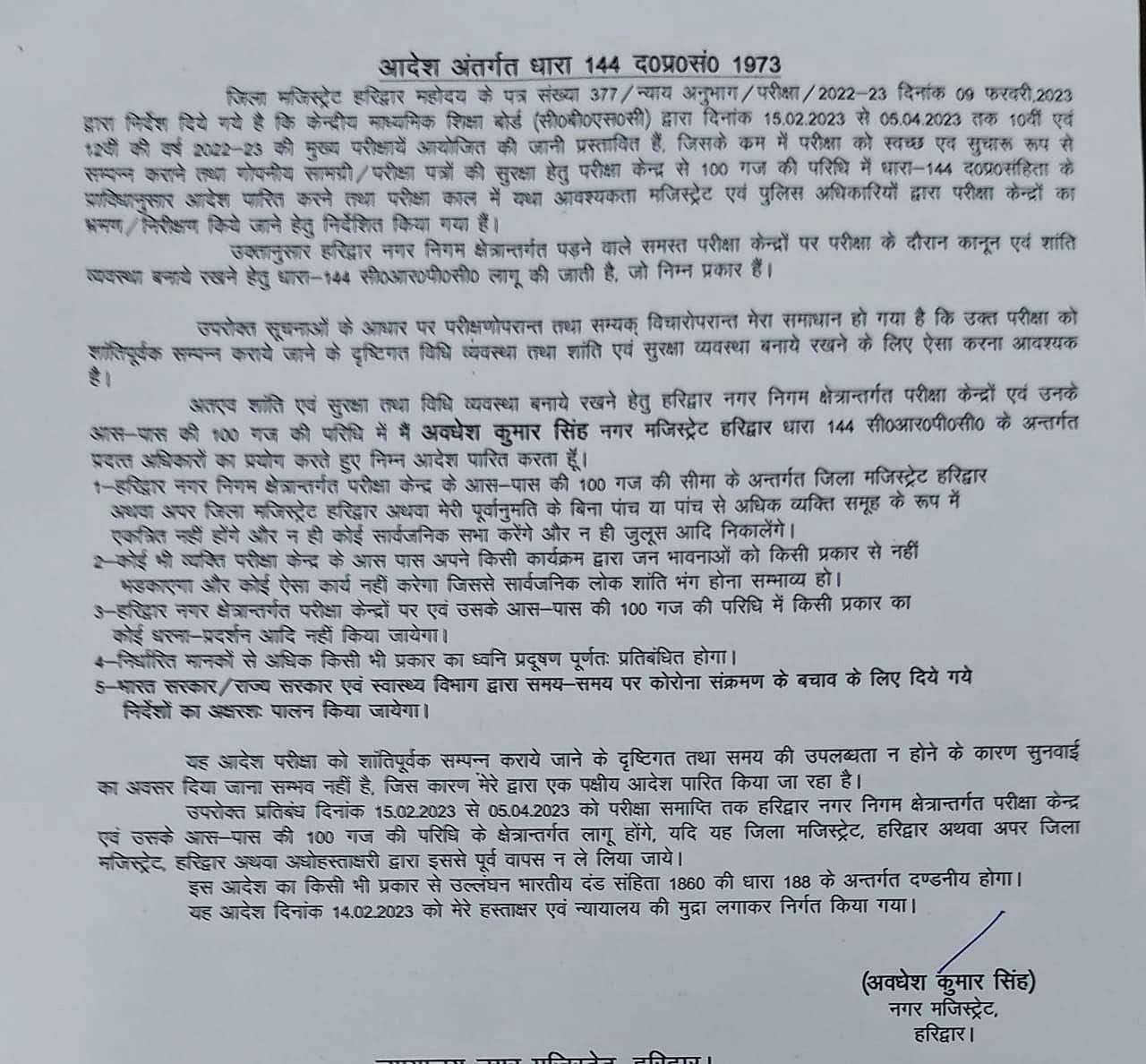 हरिद्वार। केन्द्रीय माध्यमिक शिक्षा बोर्ड की 15 फरवरी से आयोजित होने वाली 10वीं व 12वीं की परीक्षाओं के मददेनजर जनपद के परीक्षा केन्द्रों में धारा 144 लागू की गयी है। जिला मजिस्ट्रेट, हरिद्वार के आदेशों के क्रम में नगर मजिस्ट्रेट, हरिद्वार ने नगर निगम क्षेत्र के अंतर्गत परीक्षा केन्द्रों पर परीक्षा को शान्तिपूर्ण ढंग से सम्पन्न कराने तथा परीक्षा केन्द्रों में कानून व्यवस्था बनाए रखने की दृष्टि से 15.02.2023 से 5 अप्रैल 2023 तक धारा-144 लगाई है। परीक्षा केन्द्रों की 100 गज की परिधि के अन्तर्गत 4 से अधिक व्यक्तियों के एक साथ एक स्थान पर एकत्रित होने, ध्वनि विस्तारक यंत्रों का प्रयोग करने, पाठ्य साम्रगी ले जाने, सेलुलर फोन, पेजर, किसी प्रकार के अस्त्र-शस्त्र, आतिशबाजी करने, पम्पलेट, पोस्टर बैनर लगाने पर प्रतिबंध रहेगा।