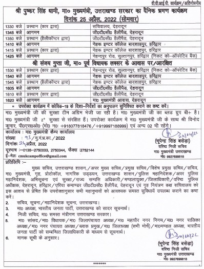 हरिद्वार। उत्तराखंड के मुख्यमंत्री श्री पुष्कर सिंह धामी कल हरिद्वार भ्रमण पर रहेंगे। वरिष्ठ निजी सहायक द्वारा जारी कार्यक्रम के अनुसार मुख्यमंत्री कल 2:10 बजे बादशाहपुर स्थित नेहरू इंटर कॉलेज में उतरेंगे उसके बाद विभिन्न कार्यक्रमों में शिरकत करेंगे।