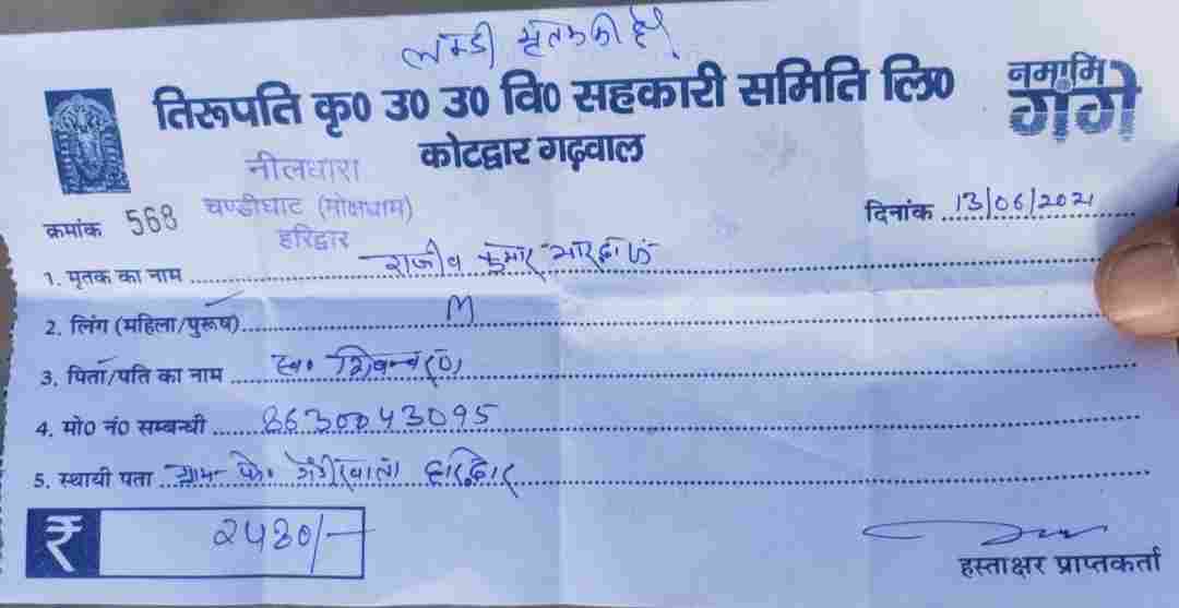मृतक के दाह संस्कार के लिए पहुंचेगा, यदि उसके पास 2480 रुपए नहीं होगें तो वह अपने मृतक का दाह संस्कार भी नहीं कर सकेगा। उत्तराखण्ड को देवभूमि कहा जाता हैं, लेकिन वहीं अपनों के मोक्ष की अभिलाषा लिए पहुंचने वालों ने कभी सोचा भी नहीं होगा कि अपनों का दाह संस्कार करने के लिए व्यवस्था के नाम पर जजिया कर भी देना पडेगा। इसे उत्तराखंड के लोगों का सौभाग्य कहा जाए या दुर्भाग्य, यह लोग आपदा के समय में भी अवसर तलाशते हुए धन जुटाने में जुटे हैं। व्यापारी नेता विपिन शर्मा का आरोप हैं कि श्मशान घाट के बाहर बनी दुकानदारों का कहना था कि यहां पर दाह संस्कार की आड में लूट खसोट मची हुई है, अगर कोई पूछ लेता है तो 2480 की रसीद कटती है वरना यहां पर दस हजार रूपये तक ले लिए जाते है। तिरूपति कृ.उ.उ.वि. सहकारी समिति लि. कोटद्वार