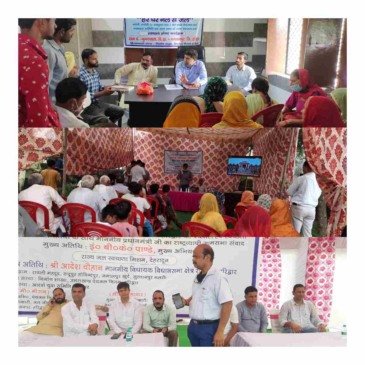 उक्त ग्राम के अतिरिक्त जनपद हरिद्वार में जल निगम एवं जलसंस्थान द्वारा अन्य 23 ग्राम सभाओं में कार्यक्रम आयोजन किये गये जिसमें ग्रामवासियों के प्रशिक्षण क्षमता एवं कौशल निर्माण हेतु राज्य सरकार/जनपद स्तरीय द्वारा कार्यान्वयन सहयोगी संस्थाओं (ISA) को कार्य आवंटित किया गया है। ग्रामवासियों को आई0एस0ए0 के सम्बन्ध में समुचित जानकारी दी गयी। साथ ही सहयोगी संस्थाओं द्वारा ग्रामवासियों की समस्याओं का समाधान किस प्रकार किया जायेगा के सम्बन्ध में भी अवगत कराया जायेगा। जनपद के अन्य ग्रामों में माननीय प्रधान मंत्री मोदी जी द्वारा ग्राम सभाओं के लिये किये गये संवाद को भी ग्राम वासियों को स्क्रीन के माध्यम से दिखया गया।