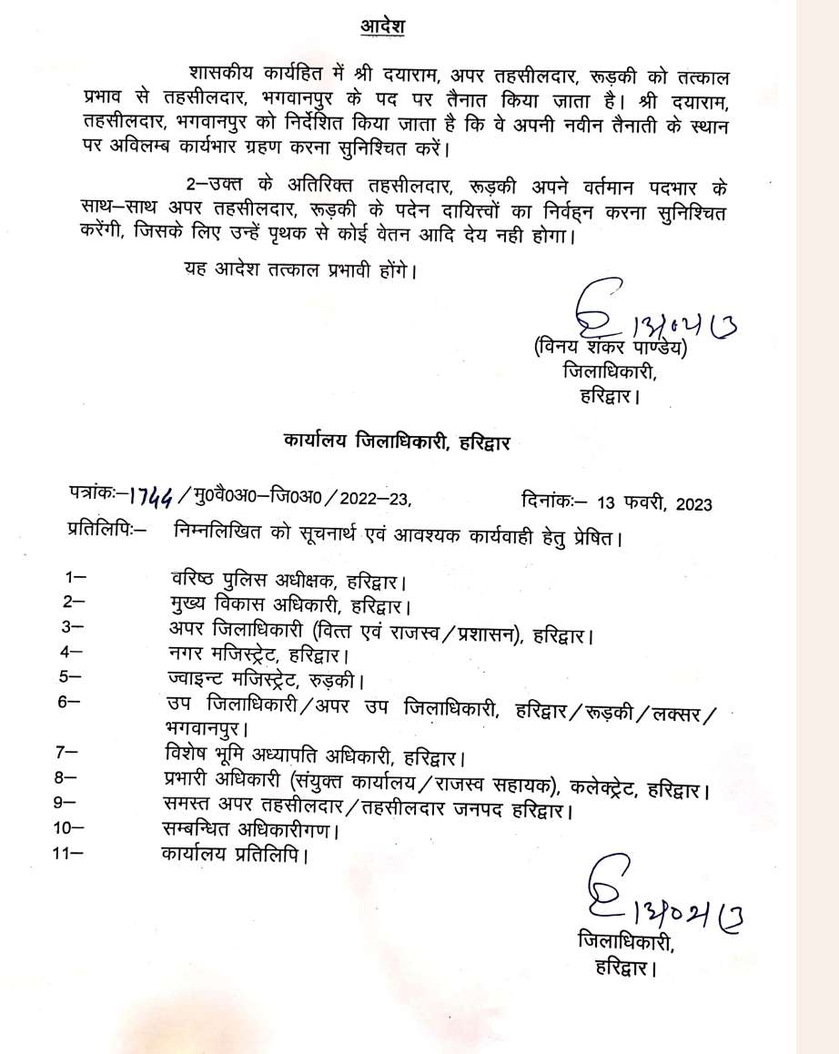 हरिद्वार। जिलाधिकारी हरिद्वार श्री विनय शंकर पाण्डेय ने शासकीय कार्यहित में श्री दयाराम, अपर तहसीलदार, रूड़की को तत्काल प्रभाव से तहसीलदार, भगवानपुर के पद पर तैनात किया जाता है। श्री दयाराम, तहसीलदार, भगवानपुर को निर्देशित किया जाता है कि वे अपनी नवीन तैनाती के स्थान पर अविलम्ब कार्यभार ग्रहण करना सुनिश्चित करें।