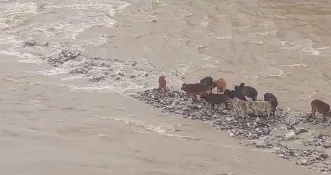 रिखणीखाल प्रखंड से 10-15 किलोमीटर आगे मंज्याडी सैण के पास पूर्वी नयार नदी बहती है। नदी कल रात की बारिश से ऊफान पर है। इस बीच अभी सिद्ध खाल से आशु जोशी ने बताया कि नदी में 11 पशु फंसे हुए हैं लेकिन बाहर आने में असमर्थ हैं। नदी का बहाव तेज है।वे बीच में ही मौन खड़े हैं।