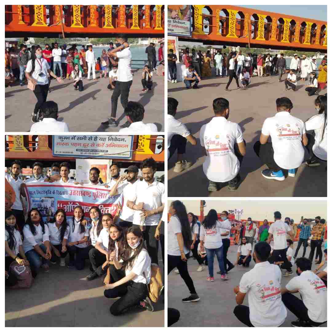 हरिद्वार। उत्तराखण्ड के पुलिस महानिदेशक द्वारा चलाए जा रहे अभियान ऑपरेशन मुक्ति के अनुक्रम में तथा वरिष्ठ पुलिस अधीक्षक हरिद्वार के दिशा निर्देशानुसार व हरिद्वार जनपद के नोडल अधिकारी क्षेत्राधिकारी नगर के पर्यवेक्षण में हर की पैड़ी क्षेत्र में जन जागरूकता अभियान मे आपरेशन मुक्ति की टीम प्रथम (एएचटीयू हरिद्वार ) द्वारा आज एस.एम.जे.एन. (पीजी) कालेज हरिद्वार के सहयोग से चलाया गया। पुलिस व कालेज के छात्र-छात्राओं द्वारा नुक्कड नाटक के माध्यम से बाल भिक्षा वृत्ति को रोकने व पूर्णता से बंद करने की अपील देशभर से आये तीर्थ यात्रियों व श्रद्धालुओं से गई तथा उत्तराखंड पुलिस द्वारा चलाये जा रहे अभियान का व्यापक प्रचार प्रसार किया गया। देशभर से आये तीर्थ यात्रियों व श्रृद्धालुओ द्वारा उक्त मुहिम की भूरि भूरि प्रशंसा भी की गई। आज हरकी पैडी पर एस.एम.जे.एन. (पीजी) कालेज की टीम आपरेशन मुक्ति के द्वारा नुक्कड़ नाटक मालवीय द्वीप पर उत्तराखंड पुलिस के दिशा निर्देशों पर प्रस्तुति दी। प्रस्तुति देने वाले छात्र-छात्राओं में मुकुल पुंडीर, कामिल मसूरी, निक्की शर्मा, जिया यदुवंशी, अंकित कुमार, शिवानी त्यागी, परिचा त्यागी, कामना त्यागी, आकांक्षा मोगा, केशव, पुलकित चड्ढा, मनोज, रितेश त्रिपाठी, नेहा पाल, शिवानी पाल, प्रिंस कुणाल, हिमांशु धीमान, साक्षी, खुशी जैन ,विकास कश्यप सम्मिलित रहें।