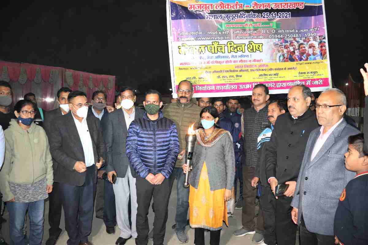 रूद्रपुर। जिलाधिकारी एवं जिला निर्वाचन अधिकारी श्रीमती रंजना राजगुरू ने गुरूवार की सांय प्रशासनिक अधिकारियों व स्कूली बच्चों के साथ गांधी पार्क से भगत सिंह चौक तक मशाल जुलूस निकाल कर जनता को वोटर लिस्ट में नाम दर्ज कराने के लिए जागरूक किया। उन्होंने अर्हता पूरी कर रहे सभी पात्र नागरिकों से मतदाता सूची में पंजीकृत होने तथा यह सुनहरा अवसर न गंवाने की अपील की।