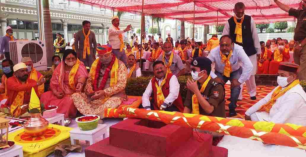 हरिद्वार। देवभूमि लोक संस्कृति विरासतीय शोभायात्रा समिति की ओर से महाकुंभ मेले के दौरान शुक्रवार को श्री बद्रीनाथ जी एवं श्री हनुमान जी की पवित्र धर्म ध्वजा की स्थापना समारोह का आयोजन श्री प्रेम नगर आश्रम में किया गया। इसके मुख्य यजमान कैबिनेट मंत्री सतपाल महाराज और पूर्व कैबिनेट मंत्री अमृता रावत कार्यक्रम में ध्वजा स्थापना के लिए वैदिक रीति रिवाज से पूजा अर्चना कर रहे हैं। आयोजन में स्वामी श्री हरिचेतनानंद महाराज, आईजी कुंभ संजय गुंज्याल, भाजपा जिलाध्यक्ष डा जयपाल सिंह चौहान आदि मौजूद हैं।