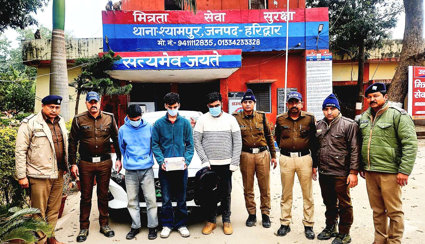 हरिद्वार। नशा तस्करों द्वारा युवा पीढ़ी को बर्बाद किया जा रहा है। अब नशा तस्करों ने नशे की सप्लाई के लिए छात्रों का उपयोग करना शुरू कर दिया है। इसी श्रंखला में 5 जनवरी को थाना श्यामपुर में गठित पुलिस की अलग-अलग चैकिंग टीमों द्वारा विभिन्न स्थानो पर चैकिग की जा रही थी। चौकी चण्डीघाट पर चैकिंग के दौरान नजीबाबाद की तरफ से हरिद्वार की ओर आ रही एक सफेद रंग की i 20 कार अचानक चिला की तरफ भागने लगी। पुलिस टीम ने तत्परता दिखाते हुए चौकी से थोड़ी ही दूरी पर चीला रोड पर स्लाईडिंग बैरियर गाडी के आगे लगा दिए जिस कारण कार चालक को मजबूरन कार रोकनी पड़ी।