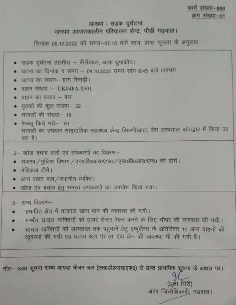 हरिद्वार। लालढांग, हरिद्वार से बारातियों लेकर कांडा, पौड़ी गढ़वाल जा रही बस में सवार सभी बारातियों का रेस्क्यू कर लिया गया है। अपर जिलाधिकारी गढ़वाल इला गिरी ने अपनी आख्या जारी करते हुए बताया की बस में 51 लोग सवार थे जिसमें से 32 की मौत हो गई है और 18 का इलाज अस्पताल में चल रहा है।