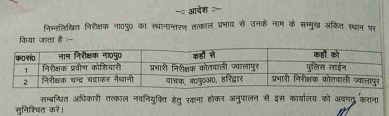 मनोज सैनी हरिद्वार। वरिष्ठ पुलिस अधीक्षक ने प्रभारी निरीक्षक कोतवाली ज्वालापुर प्रवीण सिंह कोश्यारी को तत्काल प्रभाव से स्थानांतरित करते हुए पुलिस लाइन भेज दिया है जबकि वाचक वरिष्ठ पुलिस अधीक्षक हरिद्वार चंद्र चंद्राकर नैथानी को अब ज्वालापुर का नया प्रभारी निरीक्षक बनाया गया हैं।