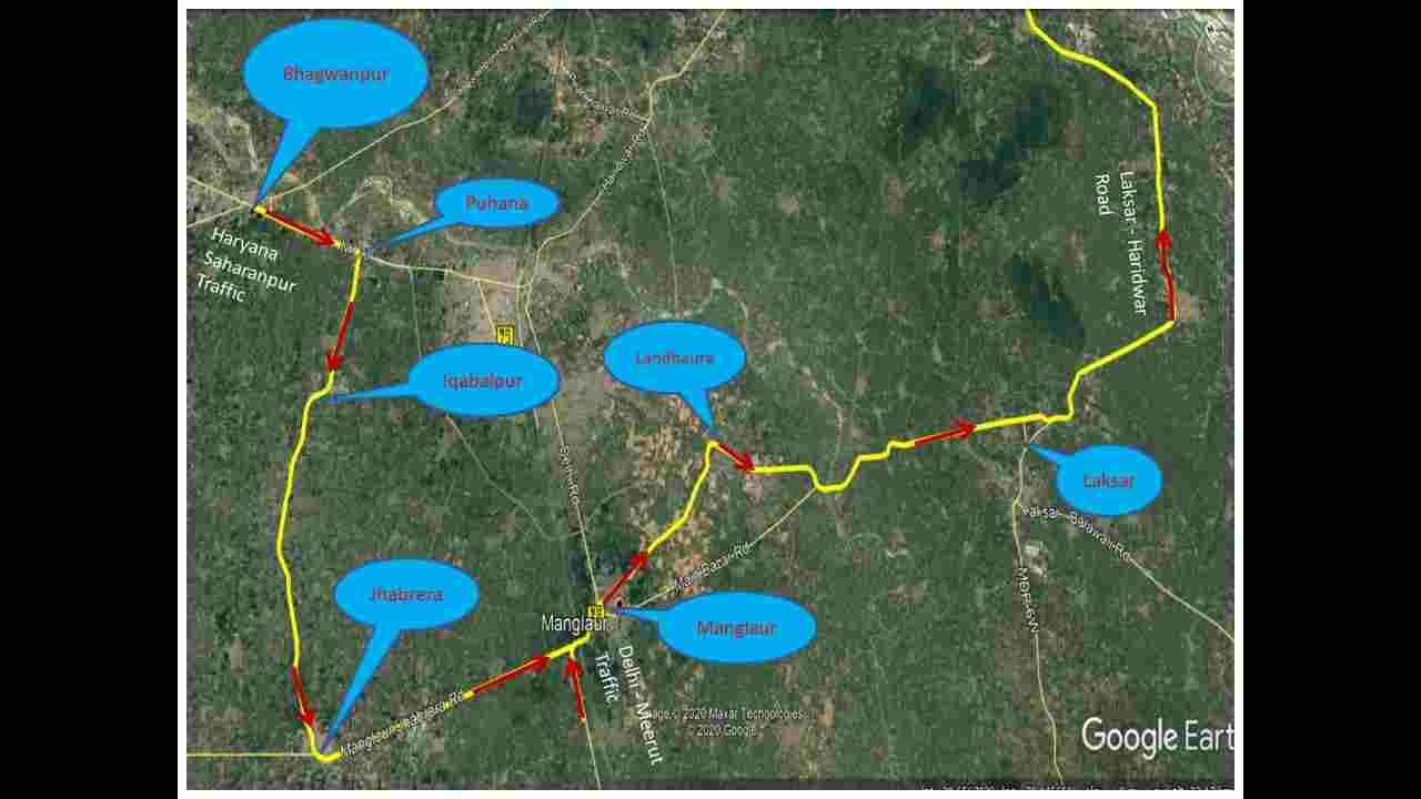 सहारनपुर-भगवानपुर-पुहाना-झबरेड़ा-मंगलौर-लँढोरा-लक्सर-जगजीतपुर-दक्षद्वीपी-बैरागी- *चमगादड़ टापू पार्किंग/दीनदयाल पार्किंग*