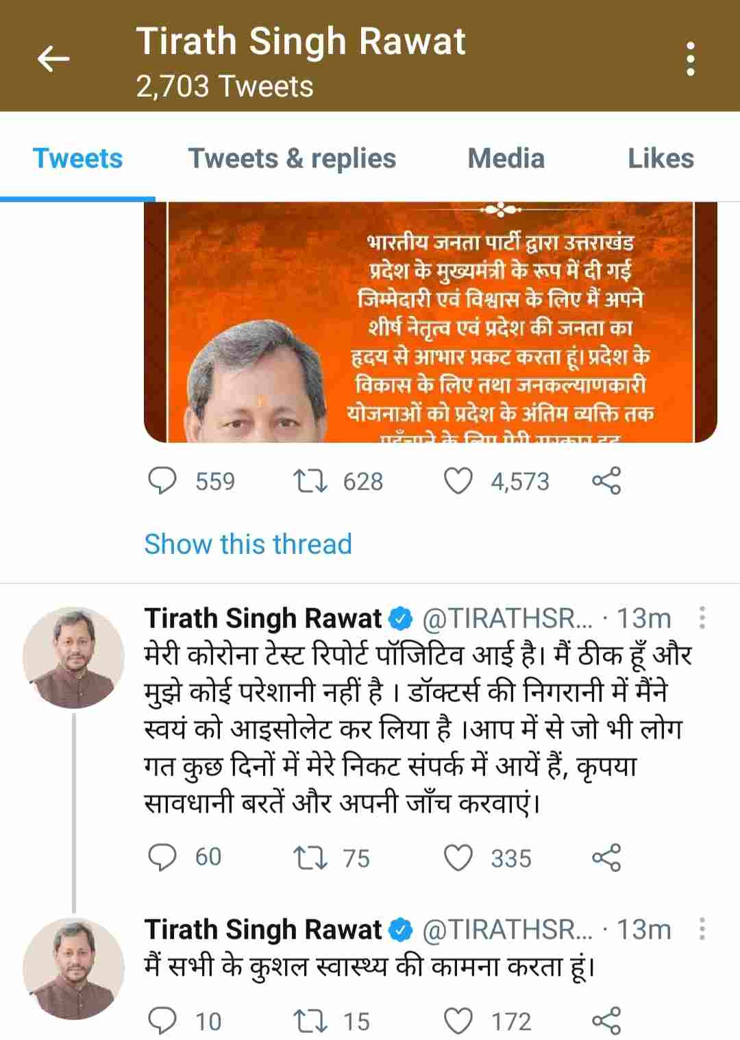 हरिद्वार। उत्तराखण्ड के मुख्यमंत्री तीरथ सिंह रावत कोरोना पॉजिटिव पाए गए है। अपने ट्वीटर एकाउंट पर जानकारी देते हुए मुख्यमंत्री तीरथ सिंह रावत ने लिखा है कि मेरी कोरोना टेस्ट रिपोर्ट पॉजिटिव आई है। मैं ठीक हूँ और मुझे कोई परेशानी नहीं है। डॉक्टर्स की निगरानी में मैंने स्वयं को आइसोलेट कर लिया है।आप में से जो भी लोग गत कुछ दिनों में मेरे निकट संपर्क में आयें हैं, कृपया सावधानी बरतें और अपनी जाँच करवाएं।