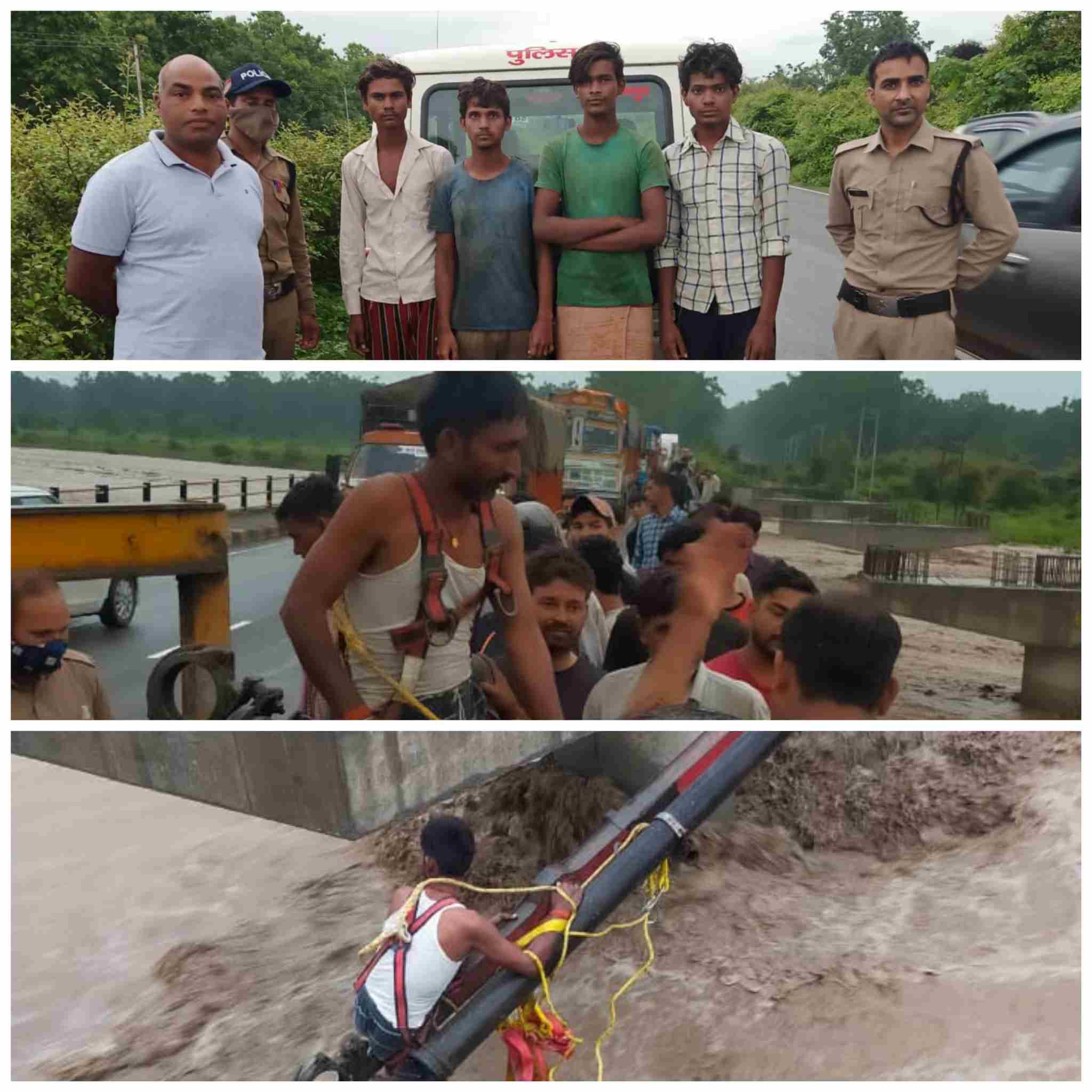 हरिद्वार। श्यामपुर पुलिस को आज सुबह लगभग 6:00 बजे सूचना मिली की पीलीनदी पुल थाना श्यामपुर में एनएएचआई का पुल निर्माण का कार्य चल रहा है जिसमे 04 मजदूर रात को नदी के बीच मे टापू पर सोये हुए थे परंतु रात में अचानक बारिश होने के कारण नदी का जल स्तर बढ़ गया जिससे मजदूर वही फंस गए। मिली सूचना पर तुरंत श्यामपुर थानाध्यक्ष अनिल चौहान मय फोर्स के मौके पर पहुंचे तथा एसडीआरएफ एवं कंट्रोल रूम को भी स्थिति से अवगत कराया गया। परन्तु समय का अभाव होने और लगातार जल स्तर बढ़ने के कारण स्वयं एनएएचआई की क्रेन बुलाकर सभी मजदूरों को सकुशल नदी से बाहर निकाला गया। जिस पर उपस्थित जनता ने और मजदूरों ने पुलिस की सराहना की। बाहर निकाले गये मजदूरों में सरजीत खान पुत्र शब्बीर खान निवासी खतोला बरेली उत्तर प्रदेश, सलमान पुत्र अख्तर खान निवासी नगरिया बरेली उत्तर प्रदेश, फिरोज पुत्र मौसम खान निवासी खतोला बरेली उत्तर प्रदेश, शोएब पुत्र हसनैन निवासी नगरिया बरेली उत्तर प्रदेश हैं।
