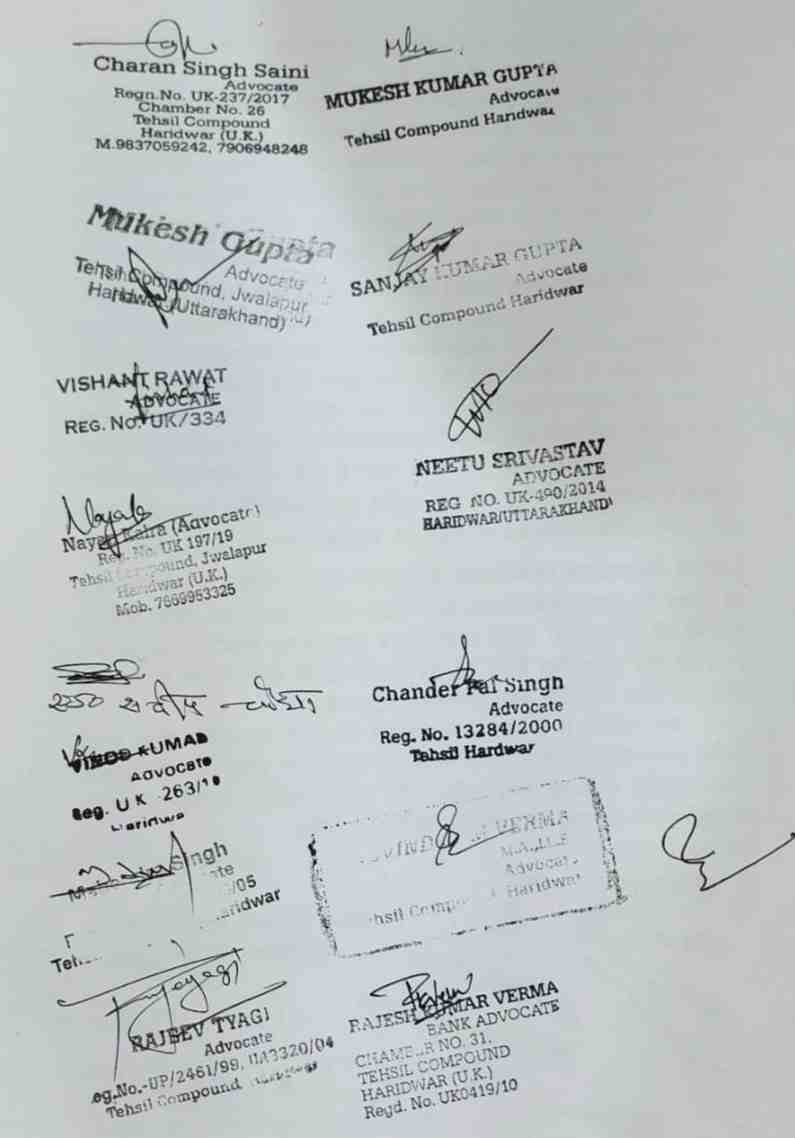 दिनांक 11 अक्टूबर को बार सदस्य श्री चरणसिंह सैनी के साथ बिजेन्द्र कुमार रजिस्ट्रार कानूनगो व अमरीश कुमार रजिस्ट्रार कानुनगो द्वारा गाली गाली गलोच की गयी तथा जान से मारने की धमकी दी गयी। तथा दिनांक 30 अक्टूबर को बार सदस्य लक्ष्मीदीप आनन्द से अमरीश कुमार रजिस्ट्रार कानुनगो द्वारा अभद्र भाषा का प्रयोग किया गया। जो अत्यन्त खेद का विषय है। अमरीश कुमार व बिजेन्द्र कुमार रजिस्ट्रार कानुनगो अपने कलम से कोई काम नहीं करते है तमाम रजिस्ट्रार कानुगो के पदेन कार्य प्राईवेट लड़के/लडकियो द्वारा अपनी हैण्डराईटिंग में किये जाते है। भुराजस्व अधिनियम 1901 की धारा 34 / 35 में नाम परिवर्तन की जो पत्रावली भूलेख नियमावली के पैरा 254 के तहतं प्राप्त होती है उन प्रत्येक पत्रावली को नाम परिवर्तन विषयक मिसिलबन्द रजिस्ट्रर (आकार पत्र र-5 क) में दर्ज किया जाता है, तत्पश्चात सम्बन्धित पक्षो को उदघोषणा (Proclamation) जारी की जाती है तदोपरान्त पत्रावली स्वीकृती के उपरान्त नामान्तरण पंजी (आकार पत्र र-6) में उसका अमलदरामद किया जाता है। ये समस्त कार्य सम्बन्धित रजिस्ट्रार कानुगो को अपने हैण्डराईटिंग में करने होते है लेकिन इनमें से कोई भी कार्य अमरीश कुमार व बिजेन्द्र कुमार रजिस्ट्रार कानुनगो द्वारा अपने हैण्डराईटिंग में नहीं किये जाते है। ये सारे शासकीय कार्य प्राईवेट लडके/लडकियो द्वारा अपने हैण्डराईटिंग में किये जाते है तथा उनको किस मद से पारितोषिक दिया जाता है। इससे स्वतः है स्पष्ट हो जाता है कि तहसील हरिद्वार में कितना भ्रष्टाचार है। वे सब प्राईवेट लडके अप्रशिक्षित (untrained) है इस कारण राजस्व पंजिकाओं में बहुत सी गलतिया (Error) रह जाती है। जो Land Record manual का खुल्लम-खुल्ला उलघंन है तथा भ्रष्टाचार का द्योतक है। इसकी शिकायत कई बार मौखिक रूप से तहसीलदार श्रीमती शालिनी मौर्य की की गयी लेकिन उन्होंने अनसुना कर इनका भरपूर सहयोग किया जा रहा है। इससे ऐसा प्रतीत होता है कि यह सब उनकी सहमति से ही हो रहा है।