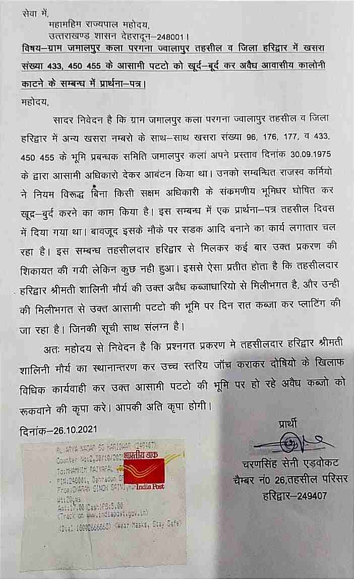 हरिद्वार। सेवानिवृत्त लेखपाल चरण सिंह सैनी ने तहसीलदार हरिद्वार पर आसामी पट्टों को खुर्द बुर्द करने का गम्भीर आरोप लगाते हुए इसकी लिखित शिकायत उत्तराखंड के राज्यपाल, मुख्यमंत्री, मुख्य सचिव व आयुक्त गढ़वाल मंडल से करते हुए लिखा है कि ग्राम जमालपुर कलां परगना ज्वालापुर तहसील व जिला हरिद्वार में अन्य खसरा नम्बरों के साथ-साथ खसरा संख्या 96, 176, 177, व 433, 450 455 के भूमि प्रबन्धक समिति जमालपुर कलां अपने प्रस्ताव दिनांक 30.09.1975 के द्वारा आसामी अधिकार देकर आवंटन किया था। उनको सम्बन्धित राजस्व कर्मियो ने नियम विरूद्ध बिना किसी सक्षम अधिकारी के संक्रमणीय भूमिधर घोषित कर खुर्द-बुर्द करने का काम किया है। इस सम्बन्ध में एक प्रार्थना पत्र तहसील दिवस में दिया गया था। बावजूद इसके मौके पर सड़क आदि बनाने का कार्य लगातार चल रहा है। इस सम्बन्ध तहसीलदार हरिद्वार से मिलकर कई बार उक्त प्रकरण की शिकायत की गयी लेकिन कुछ नहीं हुआ। इससे ऐसा प्रतीत होता है कि तहसीलदार हरिद्वार श्रीमती शालिनी मौर्य की उक्त अवैध कब्जाधारियो से मिलीभगत है और उन्ही की मिलीभगत से उक्त आसामी पट्टों की भूमि पर दिन रात कब्जा कर प्लाटिंग की जा रहा है।