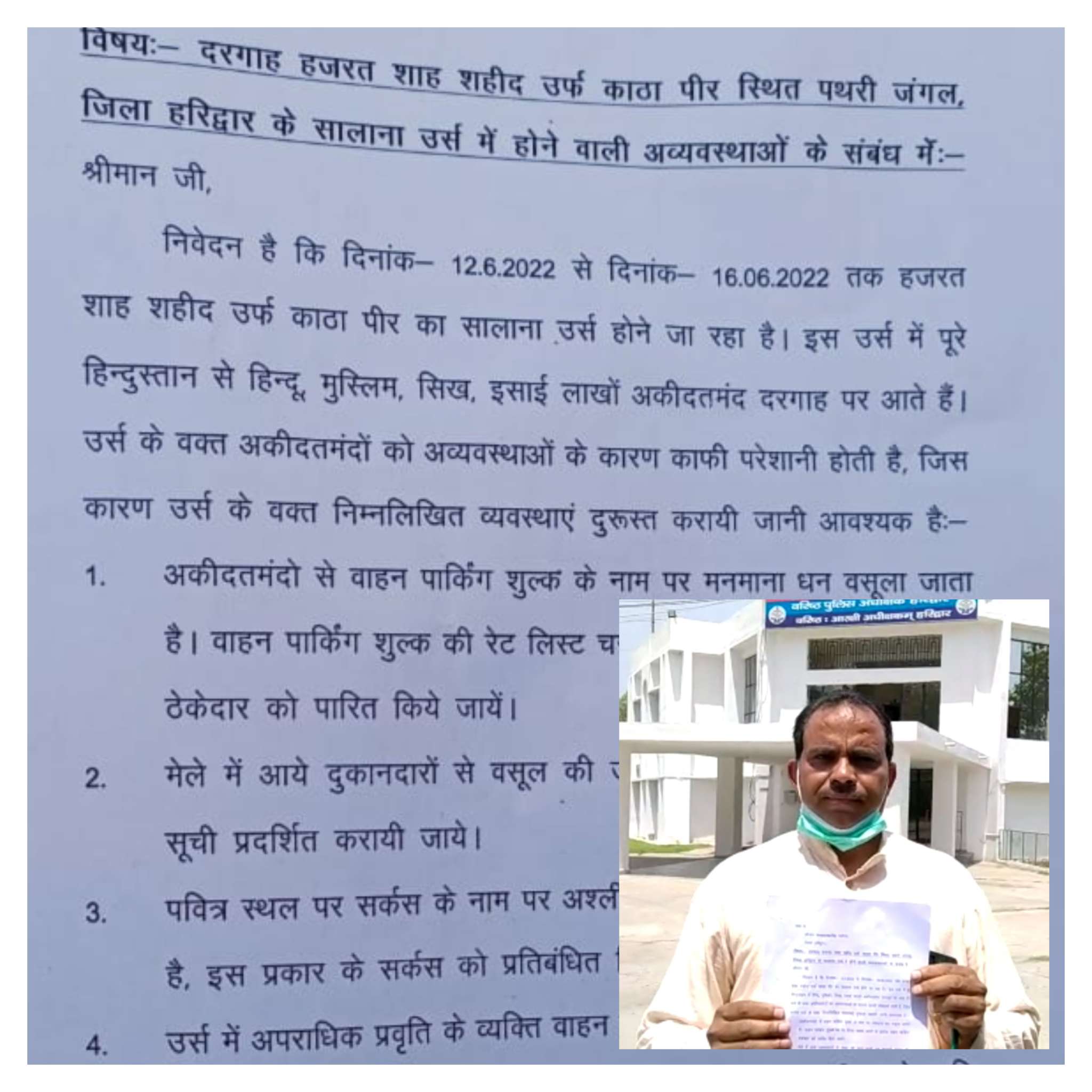 हरिद्वार। पथरी थाना क्षेत्र निवासी सामाजिक कार्यकर्ता मौ0 सलीम ने हजरत शाह शहीद उर्फ काठा पीर के सालाना उर्स पर होने वाली अव्यवस्थाओं के सम्बंध में जिलाधिकारी व एससपी, हरिद्वार के माध्यम से मुख्यमंत्री, उत्तराखंड को एक ज्ञापन प्रेषित किया है। जिसमें सलीम ने उर्स में अनेकों असामाजिक अव्यवस्थाओं से मुख्यमंत्री को अवगत कराते हुए प्रतिबन्ध लगाने की मांग की है। सलीम ने मुख्यमंत्री को लिखे पत्र में बताया है कि हजरत शाह शहीद उर्फ काठा पीर का सालाना उर्स होने जा रहा है। इस उर्स में पूरे हिन्दुस्तान से हिन्दू, मुस्लिम, सिख, इसाई लाखों अकीदतमंद दरगाह पर आते हैं।