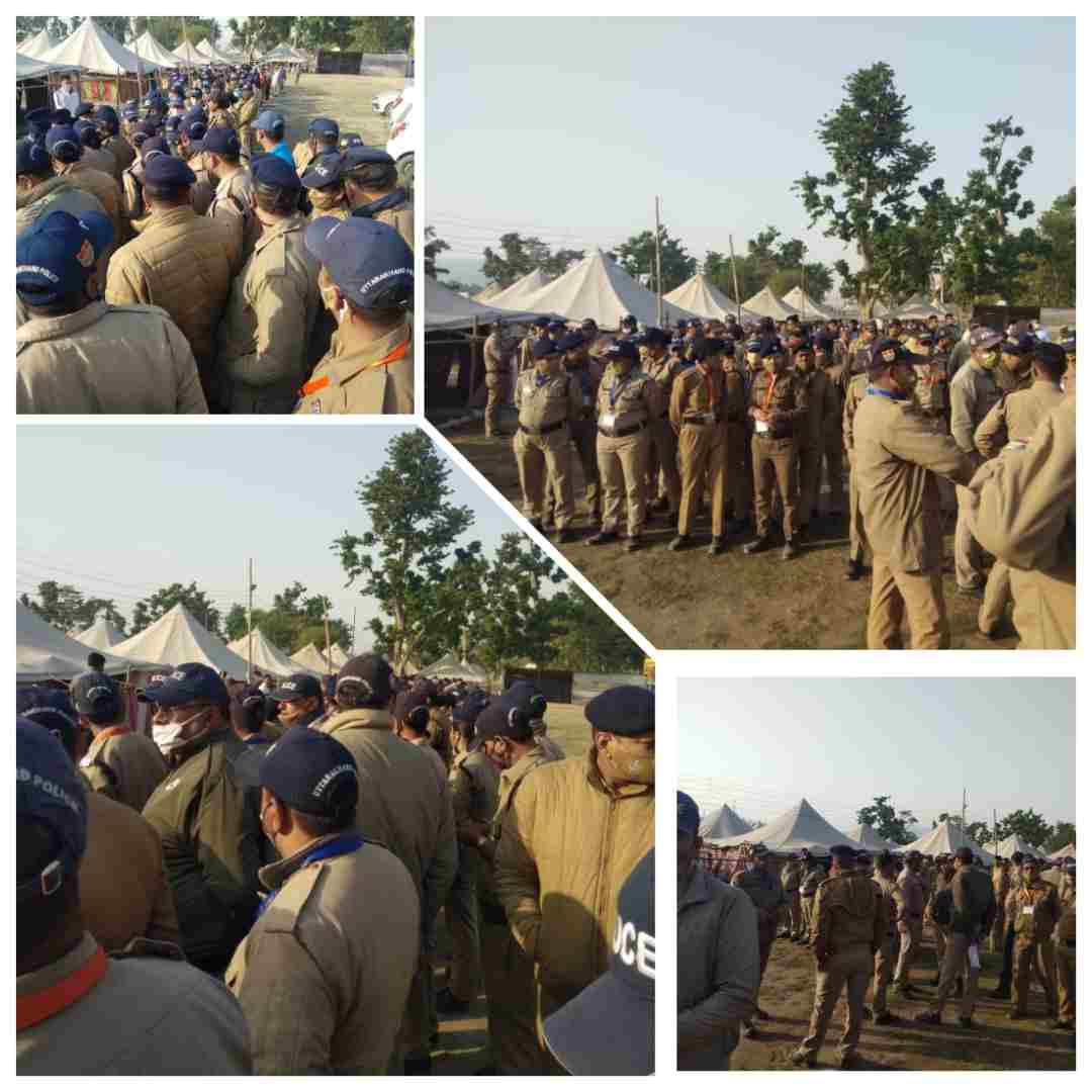 हरिद्वार। कोरोना संक्रमण के बीच महाकुंभ 2021 अपने चरम काल पर है। सरकार व मेला प्रशासन ने कुम्भ मेले में कोरोना संक्रमण को बढ़ने से रोकने के लिये दिशा निर्देश भी जारी किया है जिसमें 2 गज की दूरी व मुहँ पर मास्क लगाना अनिवार्य है। इसके लिये सम्पूर्ण मेला क्षेत्र में पोस्टर व होर्डिंग्स पाट रखे है साथ ही मोबाइल की ट्यून, मैसेज व सरकार द्वारा अखबारों में भी बड़े बड़े विज्ञापन भी छपवा रही है। इन सबके बावजूद जिस विभाग पर इन नियमों का कड़ाई से पालन करवाने का जिम्मा है उन्हें ही इन नियमों व दिशा निर्देशों की बखियाँ उधेड़ते हुए देखा जा रहा है। हमारे विशेष संवाददाता द्वारा कुम्भ मेले को सकुशल सम्पन्न कराने के लिये बनाये गए थाना पंतद्वीप की अभी हाल ही में भेजी गई फ़ोटो में आप देख सकते हैं कि कुम्भ मेले में तैनात पुलिस कैसे दो गज की दूरी व मुहँ पर आधे अधूरे रुप में मास्क लगाने के दिशा निर्देशों का पालन कर रही है।
