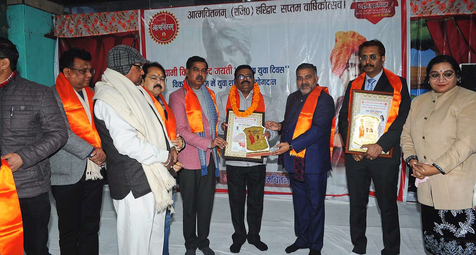 हरिद्वार। शहर की प्रमुख सामाजिक एवं आध्यात्मिक संस्था आत्म चिंतनम परिवार द्वारा स्वामी विवेकानंद जी की 161वी जयंती आज 12 जनवरी को सांस्कृतिक कार्यक्रमों एवं हर्षोल्लास के साथ राष्ट्रीय युवा दिवस के रूप में मनाई गई। इस दौरान आयोजित कार्यक्रम में समाज के विभिन्न क्षेत्रों में उत्कृष्ट कार्य करने वाले लोगों को संस्था की ओर से युवा प्रेरणा सम्मान प्रदान कर उन्हे मंच से सम्मानित किया गया। शुक्रवार को ज्वालापुर रेलवे रोड स्थित पाइन क्रेस्ट एकेडमी स्कूल में आत्मचिंतनम परिवार की ओर से स्वामी विवेकानंद जयंती पर विकसित भारत में युवा शक्ति का योगदान विषय पर संगोष्ठी एवं युवा प्रेरणा सम्मान समारोह का आयोजन किया गया। कार्यक्रम में शहर के नव युवक महिलाएं एवं गण मान्य लोग बडी संख्या में शामिल हुए। कार्यक्रम की शुरुआत मुख्य अतिथियों के द्वारा दीप प्रज्ज्वलित कर की गई। रानीपुर विधायक आदेश चौहान पूर्व मेयर मनोज गर्ग एव भाजपा के वरिष्ठ नेता समाजसेवी डॉ विशाल गर्ग एव संस्था के अध्यक्ष पं उमाशंकर वशिष्ठ ने संयुक्त रूप से दीप प्रज्वलित कर कार्यक्रम की शुरुआत की।