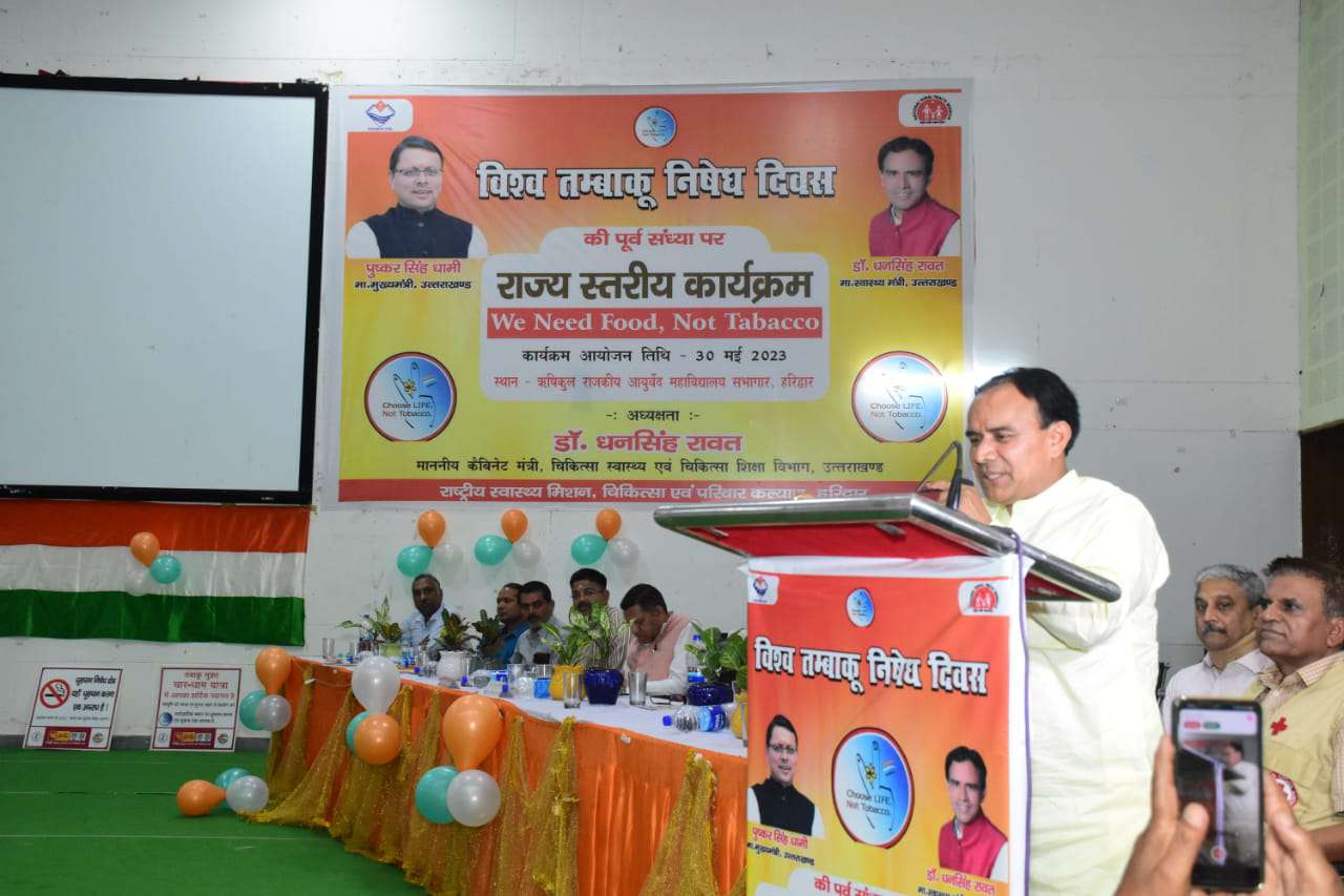 हरिद्वार। विश्व तम्बाकू निषेध दिवस की पूर्व संध्या पर ऋषिकुल राजकीय आयुर्वेद महाविद्यालय हरिद्वार के सभागार में राज्य स्तरीय कार्यक्रम का आयोजन किया गया। इस कार्यक्रम में डा० धनसिंह रावत, स्वास्थ्य मंत्री उत्तराखण्ड सरकार ने मुख्य अतिथि के रूप में प्रतिभाग किया गया। साथ ही विधायक आदेश चौहान, सजंय गोयल, जिला अध्यक्ष भाजपा हरिद्वार एवं श्री तन्मय वशिष्ट महामंत्री गंगा सभा हरिद्वार द्वारा प्रतिभाग किया गया। इनके अतिरिक्त डा० मनीष दत्त, मुख्य चिकित्सा अधिकारी हरिद्वार, पी0एल0 शाह, अपर जिला अधिकारी हरिद्वार, डा० पंकज जैन, अपर मुख्य चिकित्सा अधिकारी/नोडल अधिकारी एन0टी0सी0पी0, डा० राजेश गुप्ता, मुख्य चिकित्सा अधीक्षक राजकीय मेला चिकित्सालय हरिद्वार, डा० संजय कंसल, मुख्य चिकित्सा अधीक्षक, राजकीय उपजिला चिकित्सालय रूड़की, डा० आर०के० सिंह, अपर मुख्य चिकित्सा अधिकारी एन.एच.एम. हरिद्वार, चिकित्सा अधीक्षक सामुदायिक स्वास्थ्य केन्द्र लक्सर/ज्वालापुर/नारसन, डा० राणा जे सिंह, डिप्टी रिजनल डायरेक्टर द यूनियन, डा० नरेश चैधरी, सचिव रेड क्रास सोसायटी, हरिद्वार, डा० अर्चना औझा, ऑफिसर इन्चार्ज, स्टेट एन०टी०सी०पी०, श्री अनूप बमोला, स्टेट काॅर्डिनेटर एन०टी०सी०पी० ने प्रतिभाग किया।