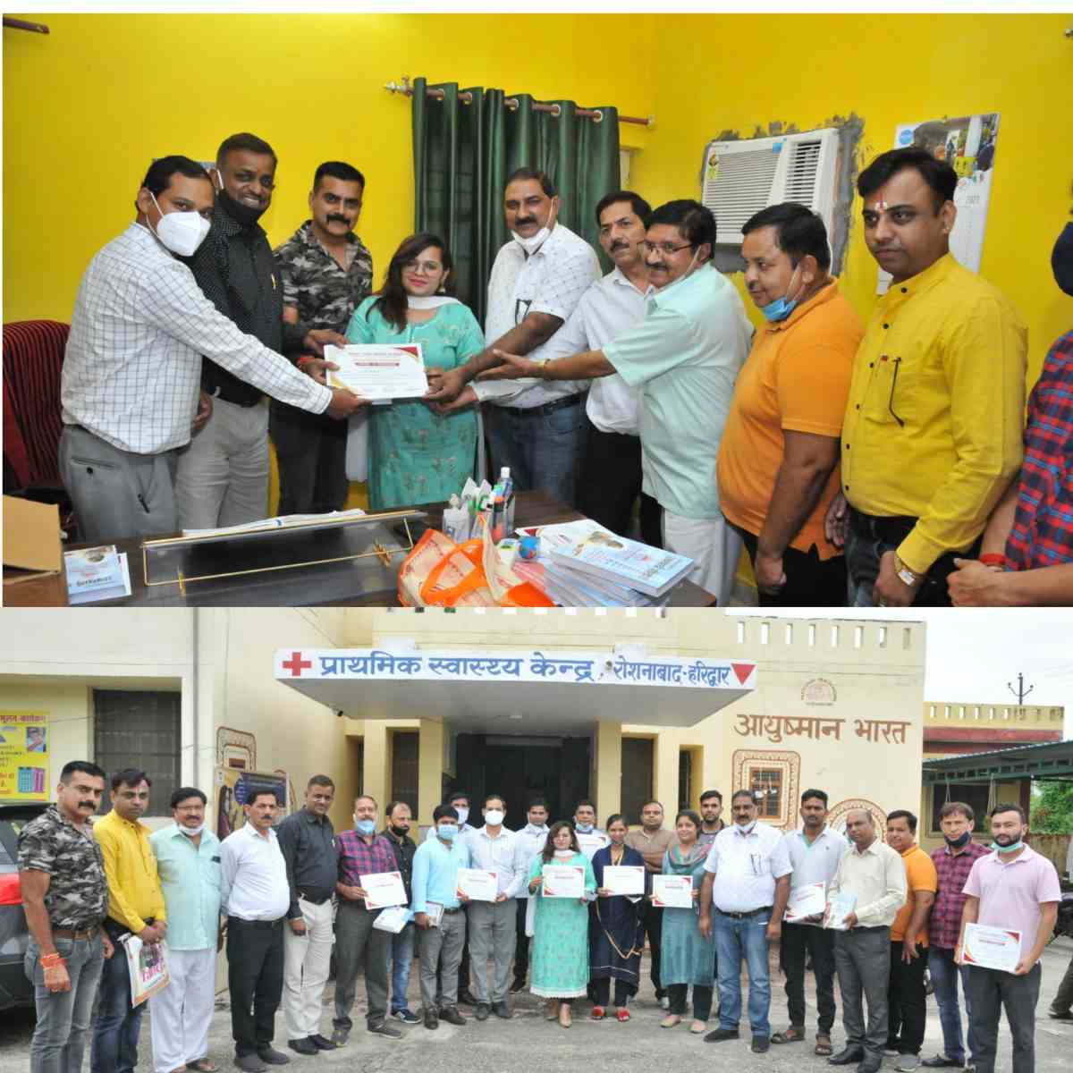 वैक्सिनेशन का कार्य भी इन अधिकारियों के मार्गदर्शन में निरंतर चल रहा है। शहर व्यापार मंडल ज्वालापुर को प्राथमिक चिकित्सा केंद्र रोशनाबाद के समस्त स्टाफ को कोरोना योद्धा के रूप में मानकर सम्मानित करते हुए गर्व हो रहा है।