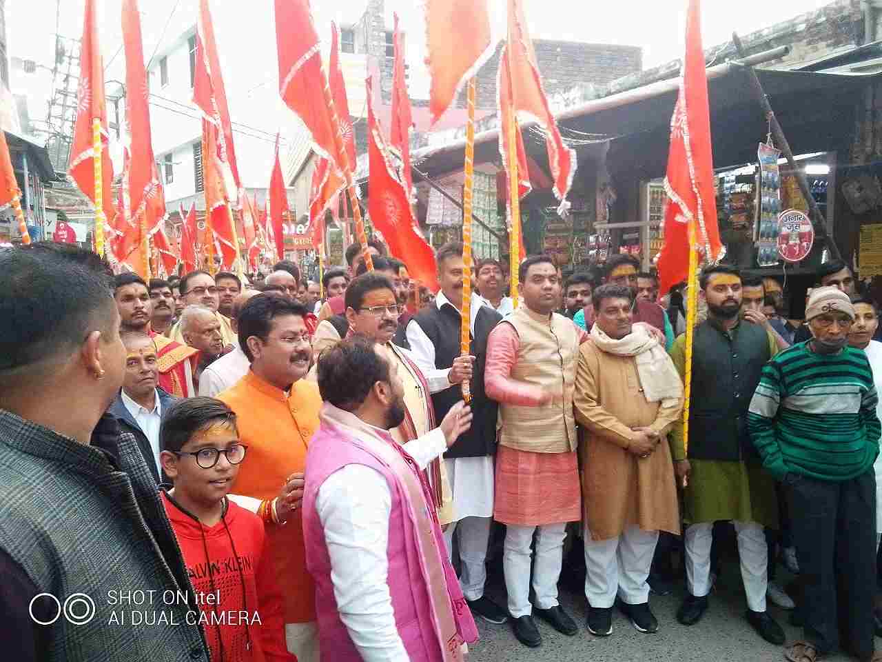 हरिद्वार। श्री गंगा सभा के संयोजन में पंचपुरी के समस्त तीर्थ पुरोहितों के द्वारा आज ज्वालापुर में ढोल नगाडों के साथ धर्मध्वजा यात्रा निकाली गई। इस मौके पर तीर्थ पुरोहितों ने नगर में आतिशबाजी करते हुए बड़ी धूमधाम के साथ हाथों में पकड़ी हुई धर्म पताकाऔ ध्वजाओं को नगर के मुख्य बाजारों से उन्हें भ्रमण करते हुए लोगों द्वारा की जा रही पुष्प वर्षा के बीच निकाला। यात्रा में हजारों तीर्थ पुरोहितों ने सामूहिक एकता का परिचय देते हुए यात्रा में बढ़ चढ़कर भाग लिया।