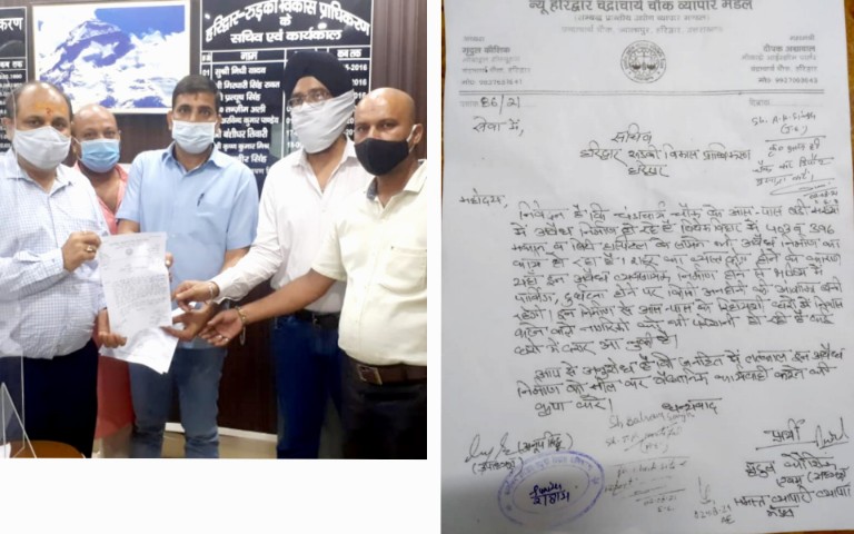 हरिद्वार। न्यू हरिद्वार चंद्राचार्य चौक व्यापार मंडल के व्यापारियों ने हरिद्वार रूड़की विकास प्राधिकरण के सचिव श्री ललित नारायण मिश्र से मिलकर चंद्राचार्य चौक क्षेत्र में बड़े पैमाने पर हो रहे अवैध व्यावसायिक निर्माणों के विरोध में आने वाली समस्याओ को देखते हुए शिकायत दर्ज कराई गई।