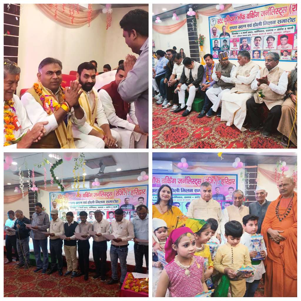 हरिद्वार। उत्तराखंड के पत्रकारों की प्रतिष्ठित संस्था स्टेट यूनियन ऑफ वर्किंग जर्नलिस्ट्स, (रजि 0,) हरिद्वार द्वारा मध्य हरिद्वार स्थित होटल जगत इन में संस्था की नवनिर्वाचित हरिद्वार इकाई का शपथ ग्रहण तथा होली मिलन कार्यक्रम हर्षोल्लास से मनाया गया। सर्वप्रथम उपस्थित अतिथियों द्वारा मां सरस्वती के चित्र पर माल्यार्पण व दीप प्रज्वलित कर कार्यक्रम का प्रारंभ किया गया।