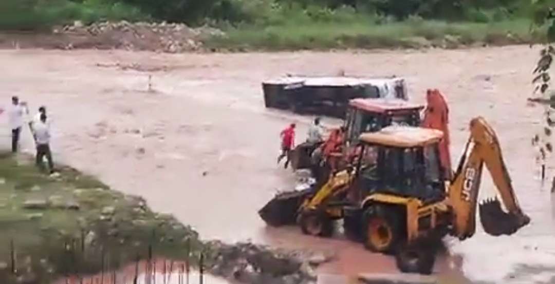 रामनगर। नैनीताल जनपद के रामनगर के धनगढ़ी में नाला उफान पर था तभी उफनते नाले को पार करते हुए कुमाऊं मंडल विकास निगम की बस पलट गई और वहां चीख पुकार मच गई। बस में 35 यात्री सवार थे, बस पलटने से किसी के भी जान माल का कोई नुकसान नहीं हुआ है।