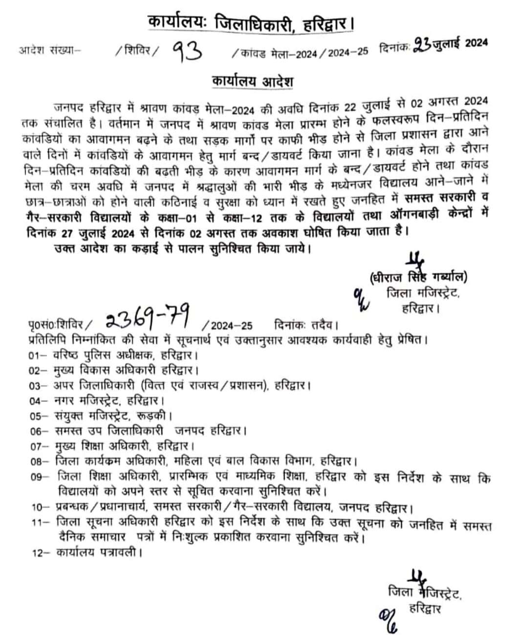 कांवड मेला के दौरान दिन-प्रतिदिन कांवडियों की बढ़ती भीड़ के कारण आवागमन मार्ग के बन्द / डायवर्ट होने तथा कांवड मेला की चरम अवधि में जनपद में श्रद्धालुओं की भारी भीड़ के मध्येनजर विद्यालय आने-जाने में छात्र-छात्राओं को होने वाली कठिनाई व सुरक्षा को ध्यान में रखते हुए जनहित में समस्त सरकारी व गैर-सरकारी विद्यालयों के कक्षा-01 से कक्षा-12 तक के विद्यालयों तथा आँगनबाड़ी केन्द्रों में दिनांक 27 जुलाई 2024 से दिनांक 02 अगस्त तक अवकाश घोषित किया जाता है। उक्त आदेश का कड़ाई से पालन सुनिश्चित किया जाये।