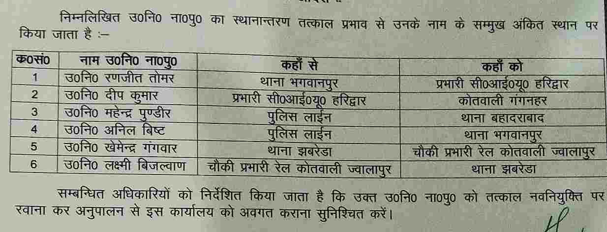 मनोज सैनी हरिद्वार। वरिष्ठ पुलिस अधीक्षक ने प्रभारी निरीक्षक कोतवाली ज्वालापुर प्रवीण सिंह कोश्यारी को तत्काल प्रभाव से स्थानांतरित करते...
