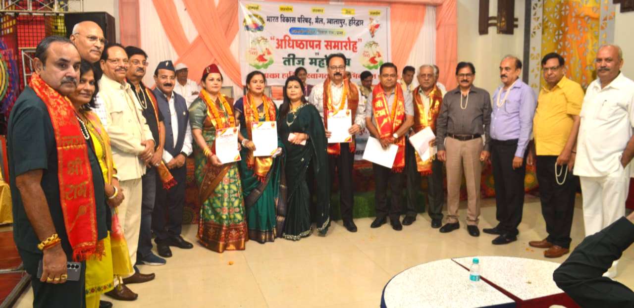 हरिद्वार। भारत विकास परिषद भेल ज्वालापुर हरिद्वार शाखा का अधिष्ठापन समारोह एवं तीज महोत्सव कार्यक्रम होटल मधुबन शंकराचार्य चौक हरिद्वार में बड़े हर्ष के साथ आयोजित किया गया। समारोह का शुभारंभ मुख्य अतिथि डॉ श्री संदीप वेदालंकार एवं अन्य विशिष्ट अतिथियों द्वारा दीप प्रज्वलन द्वारा किया गया। इसके पश्चात मुख्य अतिथि एवं अन्य अतिथियों द्वारा भारत माता एवं श्री विवेकानंद जी की मूर्ति पर माल्यार्पण किया गया। बेटी बचाओ बेटी पढ़ाओ की ब्रांड एम्बेसडर डॉ श्रीमती मनु शिवपुरी द्वारा वंदे मातरम गीत प्रस्तुत किया गया जिसमें सभी उपस्थित अतिथियों, सदस्यों, महिलाओं और बच्चों ने खड़े होकर उनका साथ दिया। डॉ मनु शिवपुरी द्वारा मंच संचालन हमारी देव वाणी संस्कृत में किया गया।