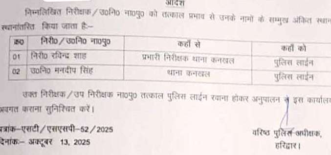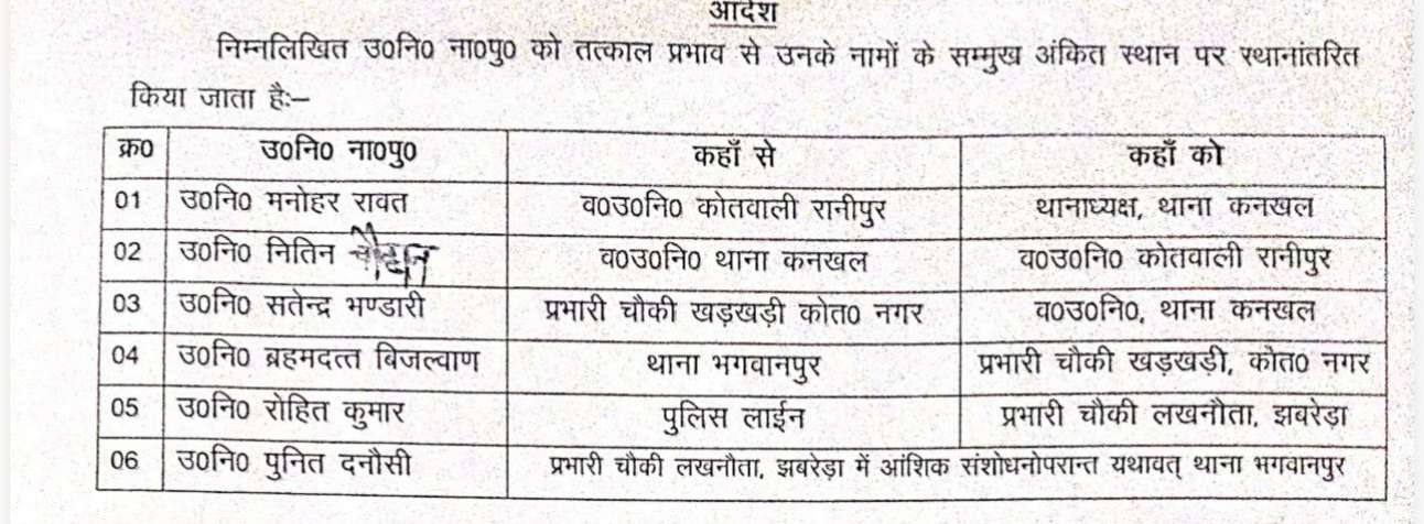 बता दें कि रवींद्र शाह अभी चन्द दिनों पहले ही कनखल थाने में स्थानांतरित होकर आए थे, उनकी जगह रानीपुर कोतवाली के वरिष्ठ उप निरीक्षक मनोहर रावत को कनखल थानाध्यक्ष बनाया गया है। जबकि कनखल थाने में तैनात वरिष्ठ उप निरीक्षक नितिन चौहान को भी रानीपुर कोतवाली वरिष्ठ उपनिरीक्षक बनाकर भेजा गया है। खड़खड़ी चौकी प्रभारी सत्येंद्र भंडारी को कनखल एसएसआई बनाया गया है। पुलिस लाइन से उपनिरीक्षक रोहित कुमार को प्रभारी चौकी लखनौता और यहां से ब्रह्मदत्त बिजल्वाण को भगवानपुर भेजा गया है। कुछ दिन पहले लखनौता चौकी प्रभारी बनाकर भेजे गए उप निरीक्षक पुनीत दसौनी को वापस भगवानपुर थाना रवाना किया गया। ऐसा माना जा रहा है कि लापरवाही के कारण इंस्पेक्टर और उप निरीक्षक को लाइन हाजिर किया गया है।