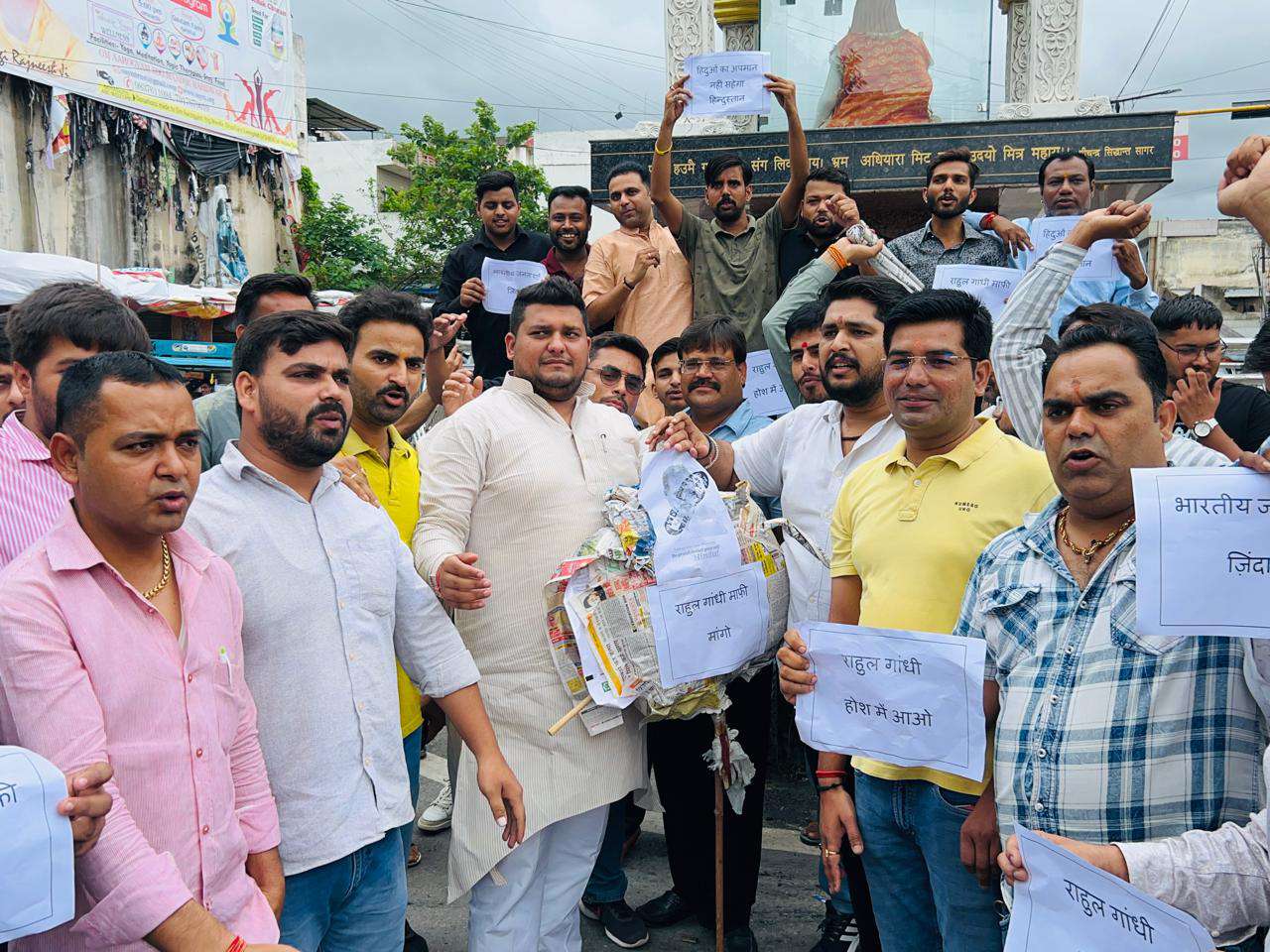 बुधवार को चंद्राचार्य चौक पर लोकसभा नेता प्रतिपक्ष राहुल गांधी का पुतला फूंकते हुए भाजयुमो के जिलाध्यक्ष विक्रम भुल्लर ने कहा कि कांग्रेस ने हमेशा तुष्टिकरण की राजनीति कर सत्ता हासिल की, लेकिन ये सत्ता से बाहर है तो देश की जनता को बांटने का काम कर रहे हैं। विक्रम भुल्लर ने कहा कि देश सनातनियों का है, जिन्हें यह स्वीकार नहीं है वे देश छोड़कर चले जाए। उन्होंने कहा कि आज देश में हर वर्ग की तरक्की हो रही है और आपस में मिल जुलकर भाईचारा निभाते हुए आजीविका निर्वहर कर रहे हैं, लेकिन विपक्षी दलों को यह रास नहीं आ रहा है। उन्होंने राहुल गांधी से इस्तीफा मांगते हुए कहा कि देश की जनता से माफी मांगों। जिला उपाध्यक्ष संदीप प्रधान, नवजोत वालिया ने कहा कि केंद्र सरकार को राहुल गांधी के विदेशी षड़यंत्रकारियों से संबंधों की भी जांच करनी चाहिए। राहुल गांधी ने करोड़ों हिंदुओं के प्रति टिप्पणी कर अपनी छोटी मानसिकता का परिचय दिया है। उन्होंने कहा कि देश विरोधी गतिविधियां हो या सनातन धर्म पर टिप्पणी, किसी भी सूरत में बर्दाश्त नहीं की जाएगी। इस मौके पर हन्नी, ऋतिक, पीयूष, चीनू, अभय चौधरी, विनित, अमन, ईलम, निखिल, मनीष त्यागी, राहुल शर्मा, दक्ष, दीपांशु शर्मा, लेखराज गुर्जर, शुभम, मनोज, रींकू, विनित यादव, अभिषेक सुयाल, हर्षित त्रिपाठी, आदित्या, सौरभ शर्मा आदि शामिल हुए।