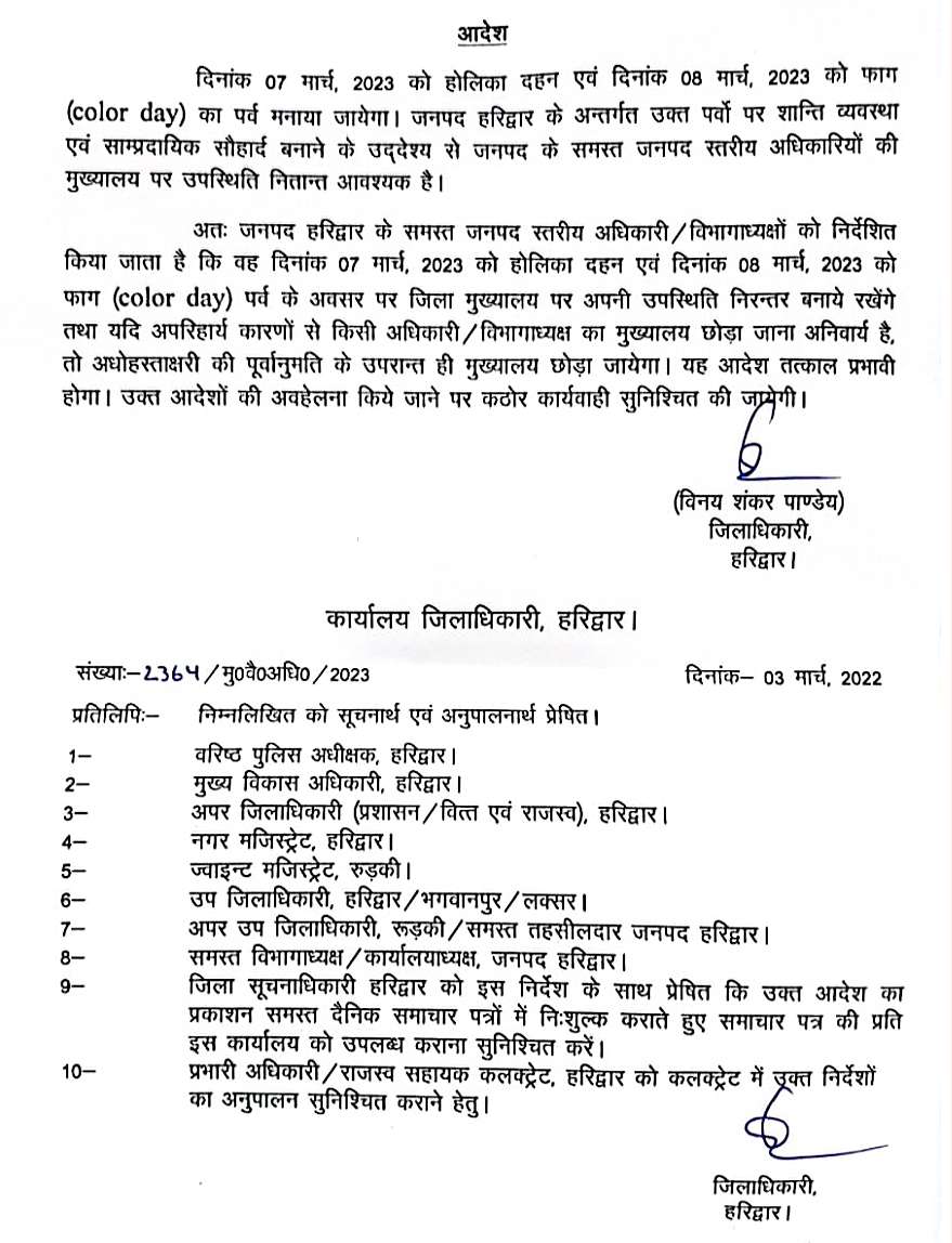 मनोज सैनी हरिद्वार। जिलाधिकारी हरिद्वार श्री विनय शंकर पांडेय द्वारा आदेशित किया गया है कि दिनांक 07 मार्च, 2023 को...