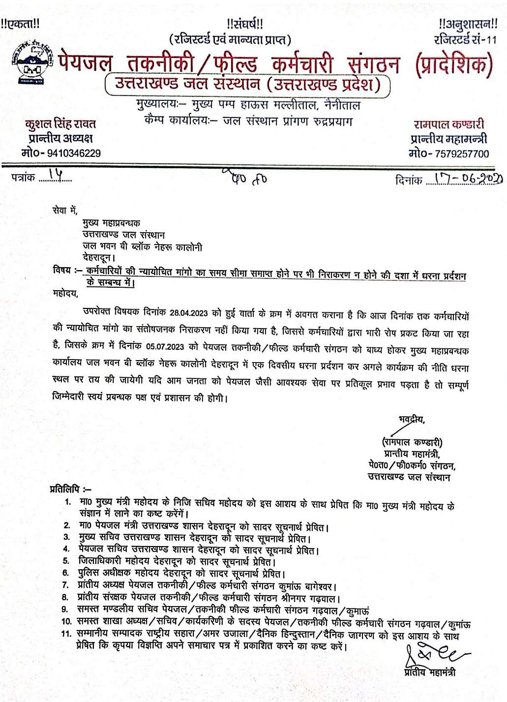 ब्यूरो देहरादून। पेयजल तकनीकी फील्ड कर्मचारी प्रादेशिक संगठन उत्तराखंड जल संस्थान के प्रांतीय महामंत्री रामपाल कंडारी ने मुख्य महाप्रबंधक उत्तराखंड...