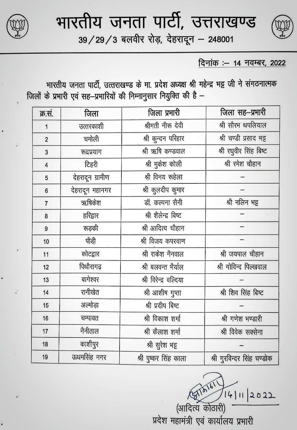 सुनील देहरादून। प्रदेश अध्यक्ष भाजपा महेंद्र भट्ट ने भाजपा उत्तराखंड के संगठनात्मक जिलों के प्रभारी एवं सह-प्रभारियों की नियुक्ति की...