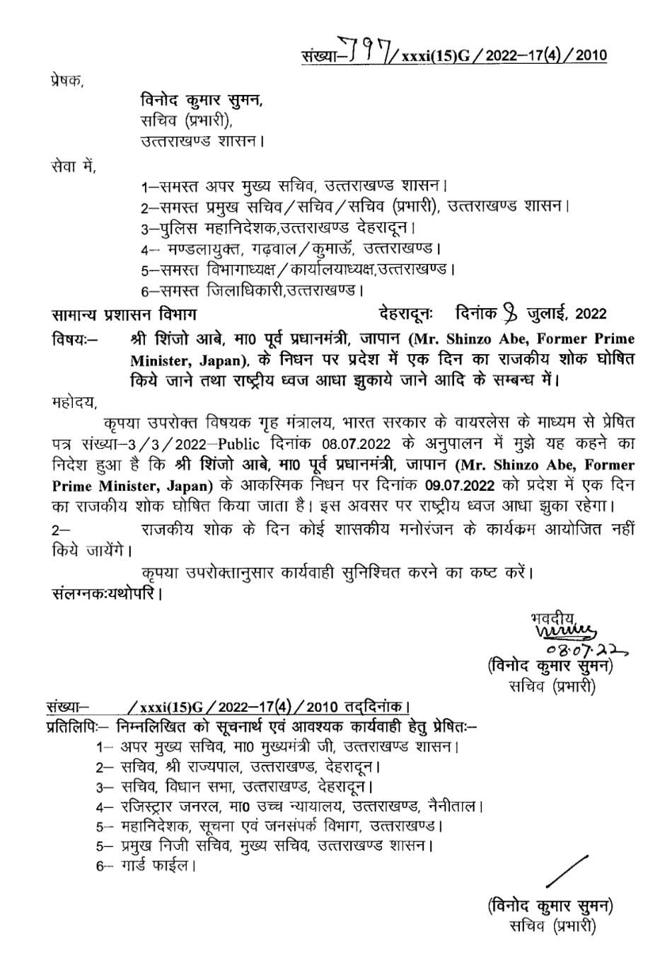 राहुल देहरादून। जापान के पूर्व प्रधानमंत्री श्री शिंजो आबे के आकस्मिक निधन पर प्रदेश में 9 जुलाई को एक दिन...