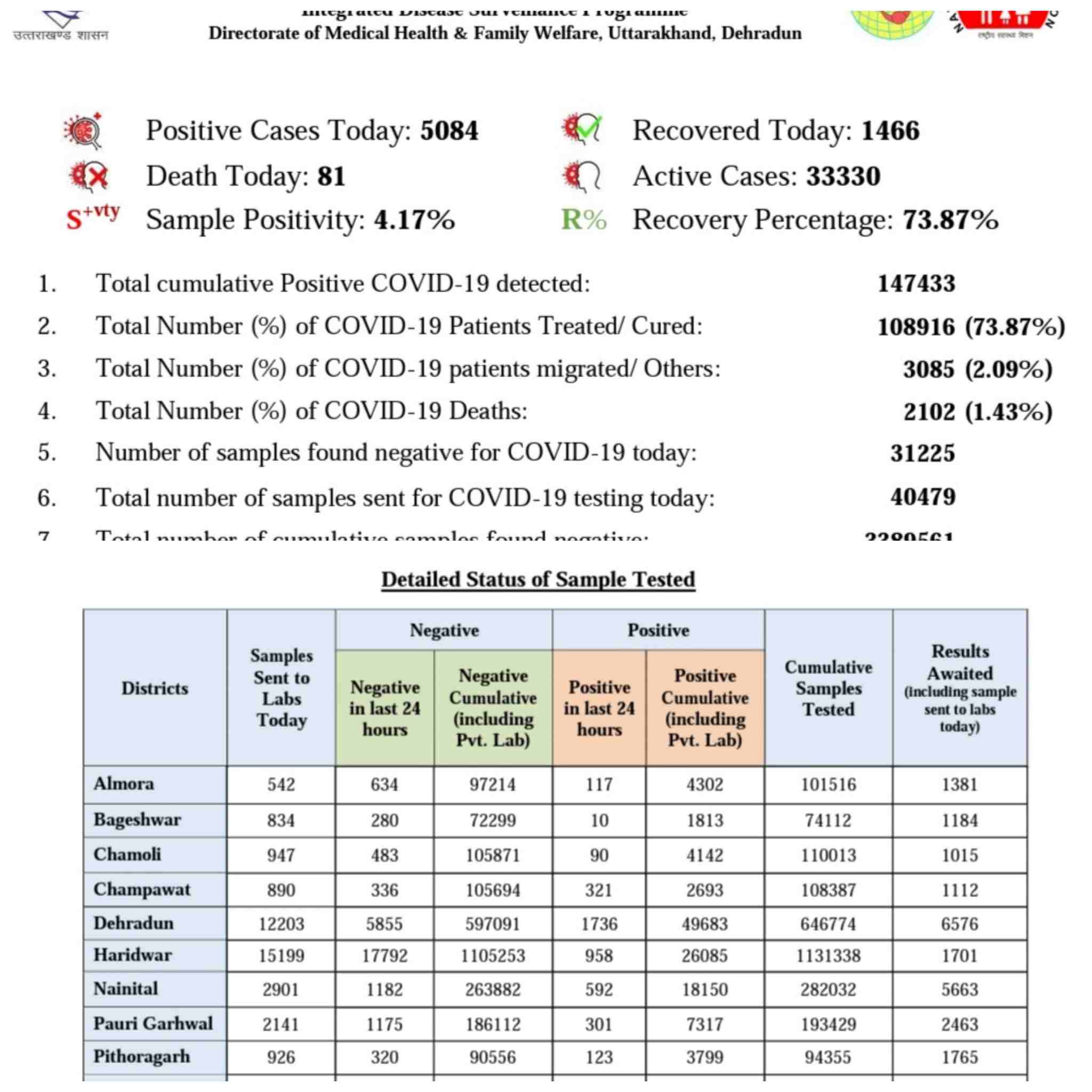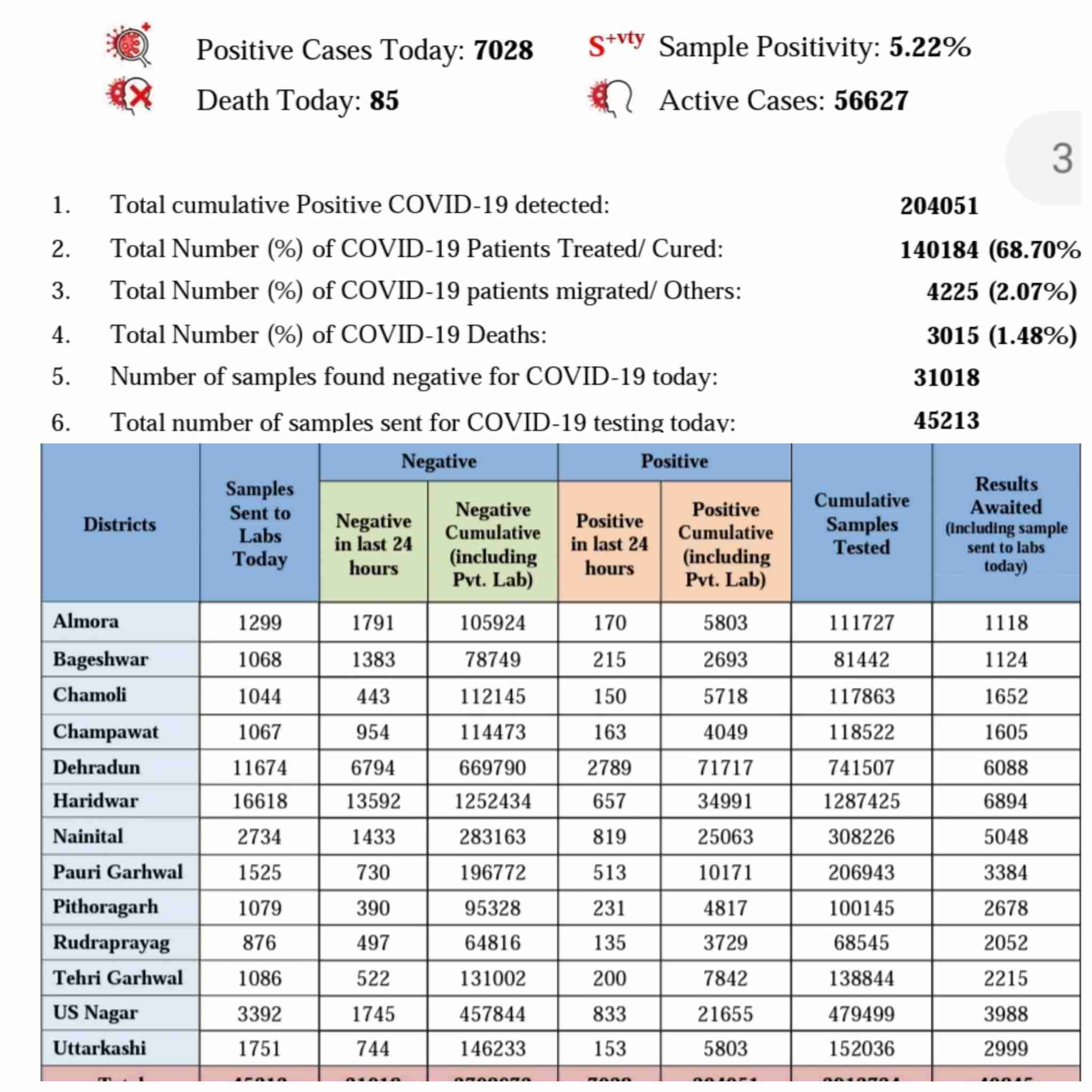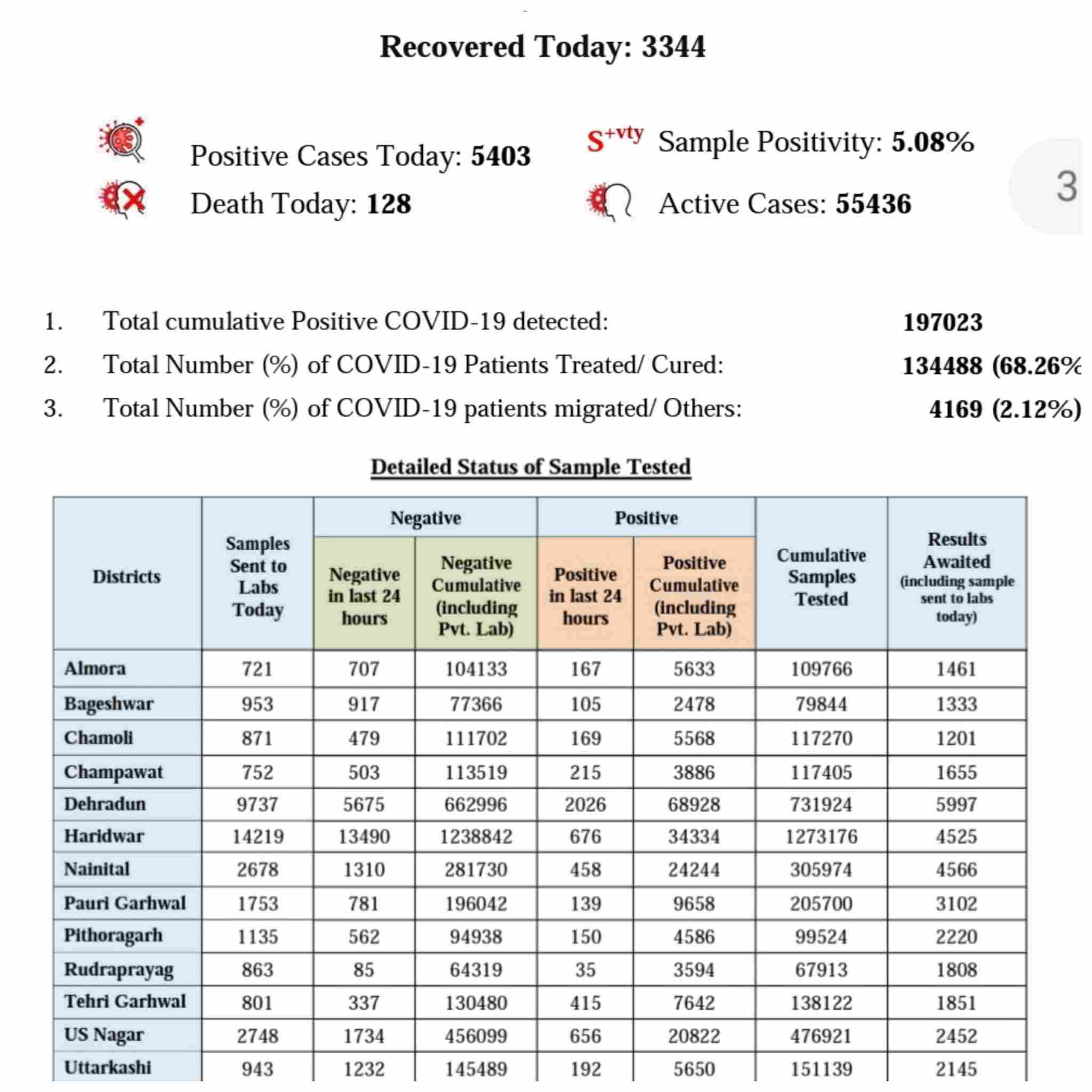 मनोज सैनी देहरादून। उत्तराखण्ड में आज विभिन्न जनपदों से 5403 कोरोना पॉजिटिव मिले है जबकि 128 लोगों की मौत कोरोना...