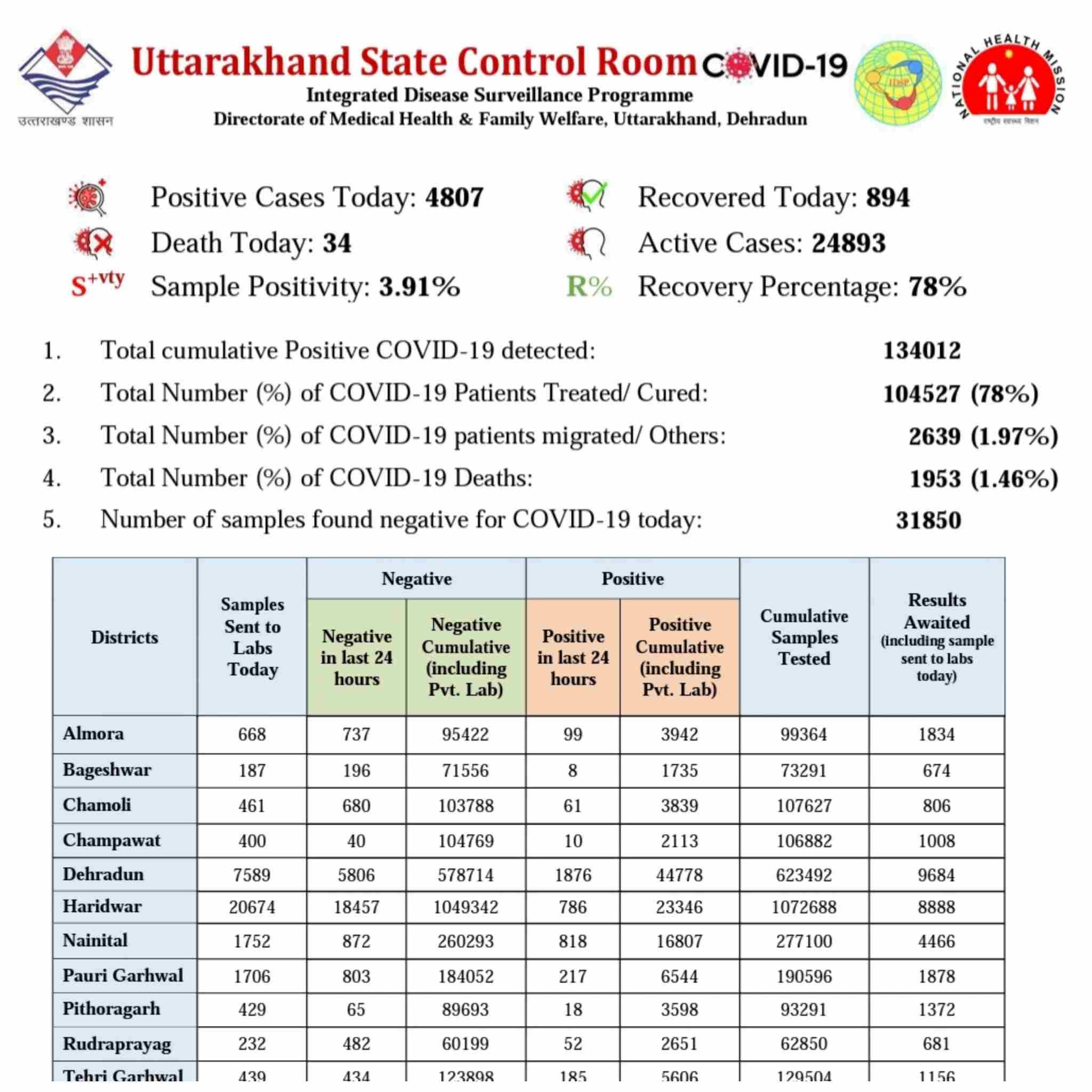 मनोज सैनी देहरादून। उत्तराखंड में आज कोरोना पॉजिटिव के रिकॉर्ड 4807 मामले आये है। जिसे मिलाकर उत्तराखंड में कोरोना संक्रमण...