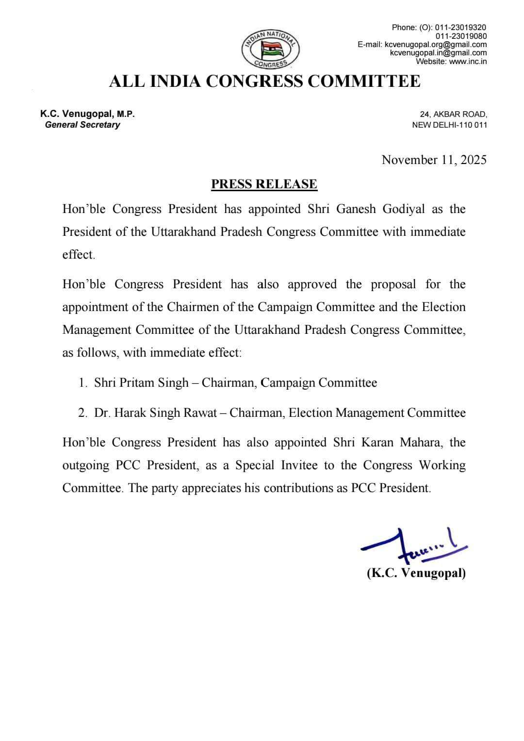 संगठन महासचिव श्री के सी वेणुगोपाल द्वारा जारी सूची के अनुसार गणेश गोदियाल को प्रदेश अध्यक्ष की जिम्मेदारी दी गई है, वहीं पूर्व अध्यक्ष प्रीतम सिंह प्रचार समिति का अध्यक्ष और पूर्व मंत्री हरक सिंह रावत को चुनाव संचालन समिति का अध्यक्ष नियुक्त किया है।