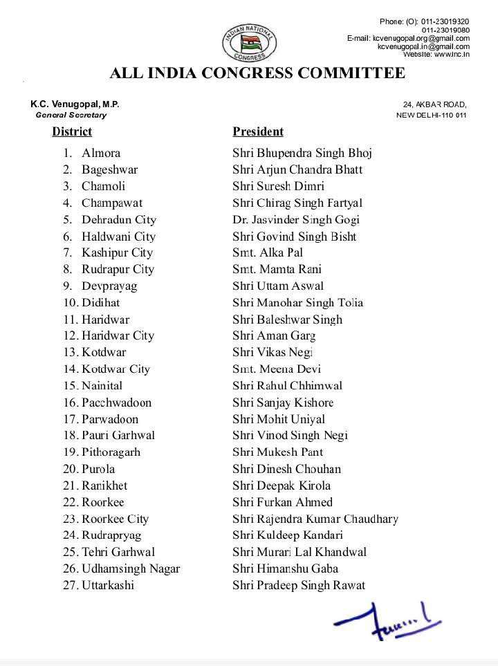 हरिद्वार। आखिरकार लंबी प्रतिक्षा के बाद भारतीय राष्ट्रीय कांग्रेस ने उत्तराखंड प्रदेश अध्यक्ष सहित प्रदेश के सभी जिलाध्यक्षों की सूची जारी कर दी है।