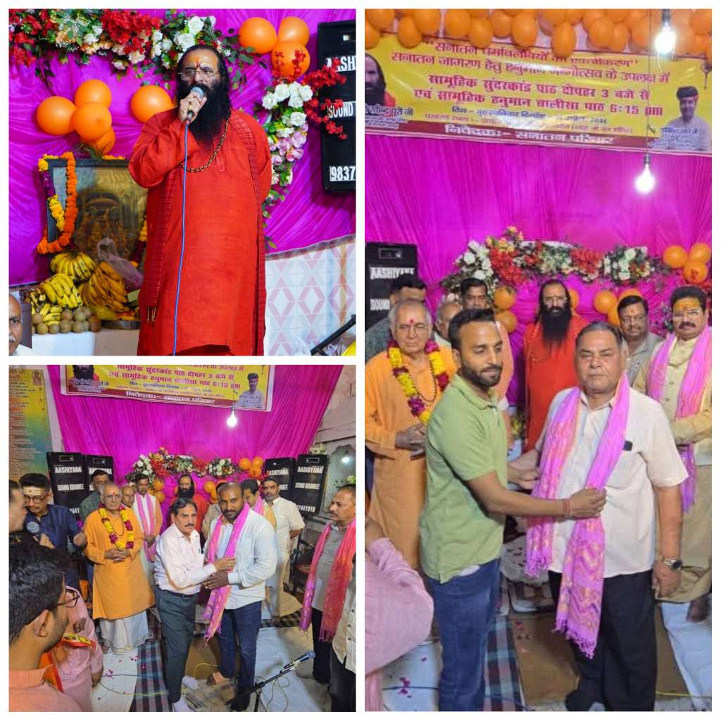 वहीं इससे पूर्व कार्यक्रम में पधारे सभी मुख्य अतिथियों का सनातन परिवार के सदस्य एवं कार्यक्रम के संयोजक दैवेज्ञ रमन, आशीष भगत, शुभम झा, शिवम पटेल, अंकुर पालीवाल, मनीष प्रधान ओर से स्वागत सत्कार माल्यार्पण करते हुए मंच से सभी को परका पहनकर सम्मानित किया। इस मौके पर मुख्य अतिथि महन्त श्री रवींद्रपुरी जी महाराज ने कार्यक्रम आयोजको को अपनी ओर से हनुमान जयंती की सभी को बधाई देते हुए उपस्थित युवाओं से सनातन धर्म की राह पर भारतीय संस्कृति की रक्षा करते हुए सनातन धर्म एवं राष्ट्र को मजबूत करने का आहवान किया। उन्होंने कहा कि आज सनातन मजबूती की राह पर है, उन्होंने कहा कि समाज में जागृति देखने को मिल रही है जिसमें केंद्र सरकार को इसका श्रेय जाता है। कार्यक्रम में पधारे विधायक चौहान, गंगा सभा के पूर्व अध्यक्ष प्रदीप झा विश्व हिंदू परिषद के पूर्व जिला अध्यक्ष वीरेंद्र कीर्ति पाल आचार्य पंडित करुणेश मिश्रा ने भी अपने विचार प्रकट करते हुए सनातन के लिए इस तरह के आयोजनों को करने के लिए अपील की।सुंदरकांड के पाठन में अनुराग शर्मा की टीम ने उपस्थित भक्तजनों को भाव विभोर कर दिया।कार्यक्रम का संचालन वरिष्ठ पत्रकार अविक्षित रमन ने किया। कार्यक्रम को सफल बनाने मे विशेष रूप से गंगा सभा के अध्यक्ष नितिन गौतम, श्रीकांत वशिष्ठ, शशांक सिखोला, यज्ञ मिश्रा जी, देवदत सिखोला जी, आशीष भक्त जी, आमेश शर्मा, प्रदीप गुप्ता जी, आदित्य कीर्तिपाल, सीमा वर्मा (वर्मा ज्वेलर्स), अभिषेक बंसल जी, मोहित विद्याकुल जी, सौरभ सिखोला जी, कटहरा बाजार व्यापार मंडल, ममता स्वीट्स, अभिषेक शर्मा,नीरज गुप्ता, संजय गुप्ता, गुप्ता केमिकल्स, शिवम श्रोतिय,नितिन मंगल, शशांक सिखोला, शांतनु सरायवाले ,शुभम झा, आकर्षिक शर्मा, आशीष गुप्ता जी, राम तिराहा समिति के समस्त व्यापारीगण एवं सनातन परिवार की युवा टीम क्षितिज मित्तल,नारायण झा, आदित्य कौशिक सुधीर मिश्रा ,सक्षम झा , ऋतव जी , अनुज सिखोला, अंश मिश्रा, वीर चाकलान प्रमुख रहे।