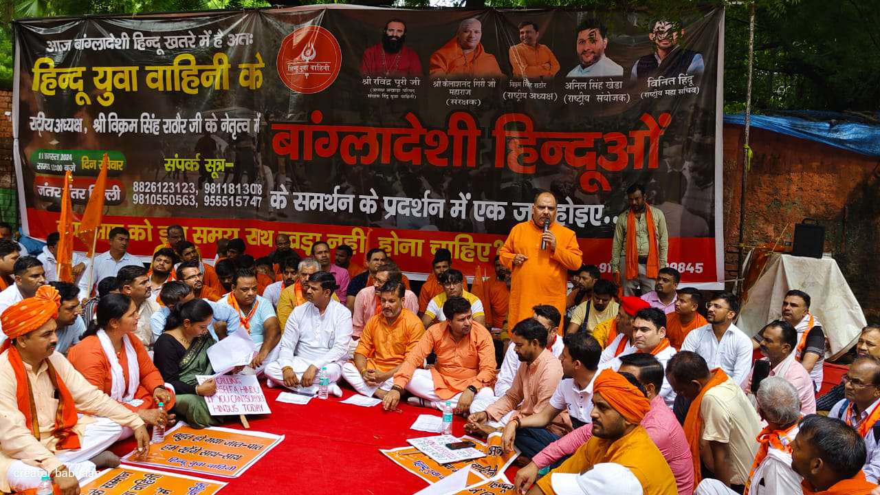 हिंदू युवा वाहिनी द्वारा जंतर मंतर पर हुए प्रदर्शन में भारत सरकार से मांग की है कि भारत में रह रहे बांग्लादेशियों को तत्काल देश से बाहर किया जाए। पश्चिम बंगाल में राष्ट्रपति शासन लागू किया जाए। बांग्लादेश से सटी भारत की सीमाओं पर निगरानी बढ़ाई जाए। बांग्लादेश में रह रहे हिंदुओं की सुरक्षा के लिए बांग्लादेश के सेना प्रमुख को कठोर भाषा में बात कर हिंदुओं की सुरक्षा सुनिश्चित कराई जाए। जितने भी हिंदुओं की अब तक हत्या हुई उनके परिजनों को एक एक व्यक्ति की हत्या पर एक एक करोड़ का मुआवजा दिलाया जाए, उनकी संपत्ति को नुकसान हुआ उसकी पूरी भरपाई बांग्लादेश करें। जितने भी हिंदू मंदिरों को जलाया गया सभी मंदिर बांग्लादेश बनाकर दे। अगर हालात नहीं सुधरे तो भारत बांग्लादेश पर हमला कर एक अलग हिंदू राष्ट्र बनाने की ओर कदम बढ़ाए। धरना प्रदर्शन में अनिल खेड़ा, अजब सिंह कपासिया, अमित त्यागी, संजय खट्टर, चैतन्य सनातनी, राहुल त्यागी, सोकेंद्र खोकर, सुनील शर्मा, विनोद महेंद्र, संजीव गौर, अनिल चौधरी, अमरीश शर्मा, चेयरमैन संग्राम सिंह, प्रेम पटेल, वीरपाल सिंह चौहान, संदीप मिश्रा, सतेंद्र चौधरी, अशोक कुमार गुप्ता, टीसी गौर, ठाकुर सचिन चौहान, प्रवेश त्यागी, संदीप त्यागी रसम, वंदना गुप्ता, भूपेंद्र शर्मा, संजीव प्रजापति, जॉनी मालपुरा अपनी टीम के साथ उपस्थित रहे।