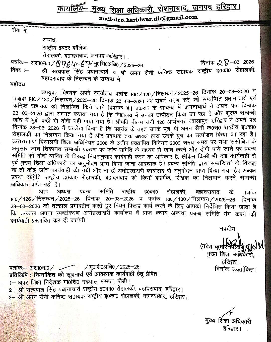 राष्ट्रीय इंटर कॉलेज के अध्यक्ष अजय चौहान को भेजे गए पत्र में मुख्य शिक्षा अधिकारी ने लिखा है कि उपयुक्त विषयक अपने कार्यालय पत्रांक RIC/126/ निलम्बन / 2025-26 दिनांक 20-03-2025 व पत्रांक RIC/130/निलम्बन /2025-26 दिनांक 23-03-2026 का संदर्भ ग्रहण करे, जो सम्बन्धित प्रधानाचार्य एवं कनिष्ठ सहायक को निलम्बित किये जाने विषयक है। प्रकरण के सम्बन्ध में प्रधानाचार्य ने अपने पत्र दिनांक 23-03-2026 द्वारा अवगत कराया गया है कि विद्यालय में उनका उत्पीडन किया जा रहा है और शुल्क सम्बन्धी जांच में मुझे कही भी दोषी नहीं पाया गया है। श्रीमति नीलम सैनी 126 आर्यनगर ज्वालापुर, हरिद्वार ने अपने पत्र दिनांक 23-03-2026 में उल्लेख किया है कि पड्यंत्र के तहत उनके पुत्र श्री अमन सैनी क०स० राष्ट्रीय ३०का० रोहालकी का निलम्बन किया गया है और प्रबन्धक तथा अध्यक्ष द्वारा उनके पुत्र का उत्पीडन किया जा रहा है। उत्तराखण्ड विद्यालयी शिक्षा अधिनियम 2006 के अधीन प्रख्यापित विनियम 2009 समय समय पर यथा संसोधित के अनुसार जांच शिकायत सम्बन्धी प्रकरण पर जांच समिति के माध्यम से जांच करने और दोषी पाये जाने पर प्रबन्ध समिति को दोषी व्यक्ति के विरुद्ध नियमानुसार कार्यवाही करने का अधिकार है, लेकिन किसी भी दंड कार्यवाही से पूर्व मुख्य शिक्षा अधिकारी का अनुमोदन प्राप्त किया जाना आवश्यक है। प्रबन्ध समिति द्वारा सम्बन्धितों के विरूद्ध ना तो कोई जांच कार्यवाही की गयी और ना ही अधोहस्ताक्षरी कार्यालय से अनुमोदन प्राप्त किया गया है। अध्यक्ष प्रबन्ध समिति राष्ट्रीय इ०का० रोहालकी, बहादराबाद को किसी कार्मिक, शिक्षक का निलम्बन करने सम्बन्धी अधिकार प्राप्त नहीं है।