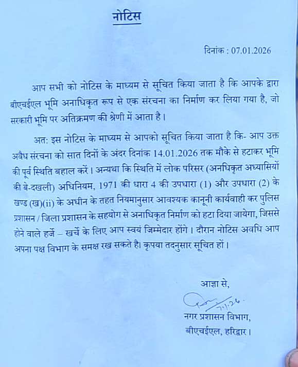 अवैध कब्जा धारकों को नगर प्रशासन विभाग, बीएचईएल, हरिद्वार की और से नोटिस के माध्यम से सूचित किया गया है कि आपके द्वारा बीएचईएल भूमि अनाधिकृत रूप से एक संरचना का निर्माण कर लिया गया है, जो सरकारी भूमि पर अतिक्रमण की श्रेणी में आता है।