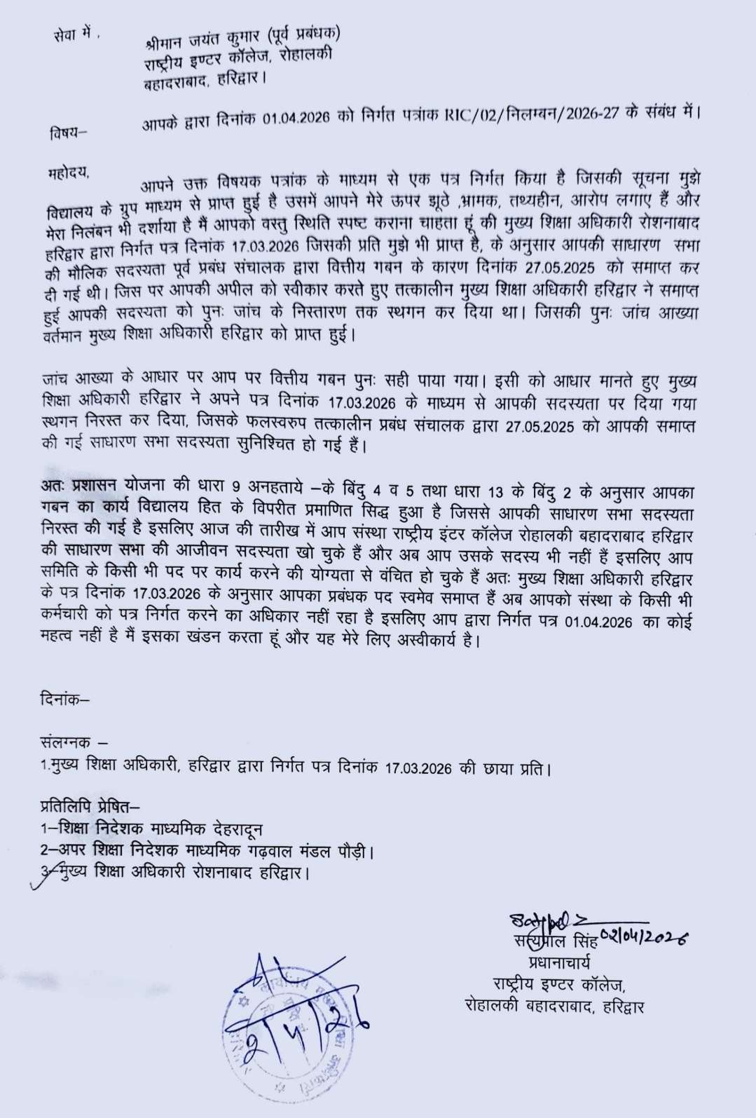 अतः प्रशासन योजना की धारा 9 अनहताये के बिंदु 4 व 5 तथा धारा 13 के बिंदु 2 के अनुसार आपका गबन का कार्य विद्यालय हित के विपरीत प्रमाणित सिद्ध हुआ है जिससे आपकी साधारण सभा सदस्यता निरस्त की गई है इसलिए आज की तारीख में आप संस्था राष्ट्रीय इंटर कॉलेज रोहालकी बहादराबाद हरिद्वार की साधारण सभा की आजीवन सदस्यता खो चुके हैं और अब आप उसके सदस्य भी नहीं हैं इसलिए आप समिति के किसी भी पद पर कार्य करने की योग्यता से वंचित हो चुके हैं अतः मुख्य शिक्षा अधिकारी हरिद्वार के पत्र दिनांक 17.03.2026 के अनुसार आपका प्रबंधक पद स्वमेव समाप्त हैं अब आपको संस्था के किसी भी कर्मचारी को पत्र निर्गत करने का अधिकार नहीं रहा है इसलिए आप द्वारा निर्गत पत्र 01.04.2026 का कोई महत्व नहीं है मैं इसका खंडन करता हूं और यह मेरे लिए अस्वीकार्य है।
