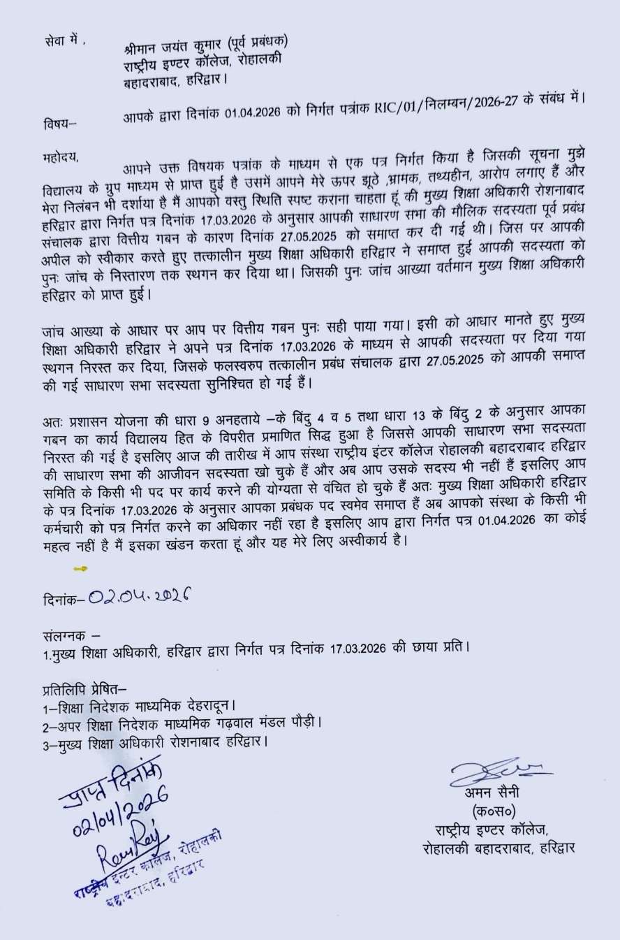 साधारण सभा के सदस्य पद और प्रबंधक पद से हटाए गए जयंत चौहान को दिए जवाब में लिखा है कि आप द्वारा दिनांक 01.04.2026 को निर्गत पत्रांक RIC/02/निलम्बन /2026-27 के माध्यम से एक पत्र निर्गत किया है, जिसकी सूचना मुझे विद्यालय के ग्रुप माध्यम से प्राप्त हुई है उसमें आपने मेरे ऊपर झूठे भ्रामक, तथ्यहीन, आरोप लगाए हैं और मेरा निलंबन भी दर्शाया है मैं आपको वस्तु स्थिति स्पष्ट कराना चाहता हूं की मुख्य शिक्षा अधिकारी रोशनायाद हरिद्वार द्वारा निर्गत पत्र दिनांक 17.03.2026 जिसकी प्रति मुझे भी प्राप्त है, के अनुसार आपकी साधारण सभा की मौलिक सदस्यता पूर्व प्रबंध संचालक द्वारा वित्तीय गबन के कारण दिनांक 27.05.2025 को समाप्त कर दी गई थी। जिस पर आपकी अपील को स्वीकार करते हुए तत्कालीन मुख्य शिक्षा अधिकारी हरिद्वार ने समाप्त हुई आपकी सदस्यता को पुनः जांच के निस्तारण तक स्थगन कर दिया था। जिसकी पुनः जांच आख्या वर्तमान मुख्य शिक्षा अधिकारी हरिद्वार को प्राप्त हुई।