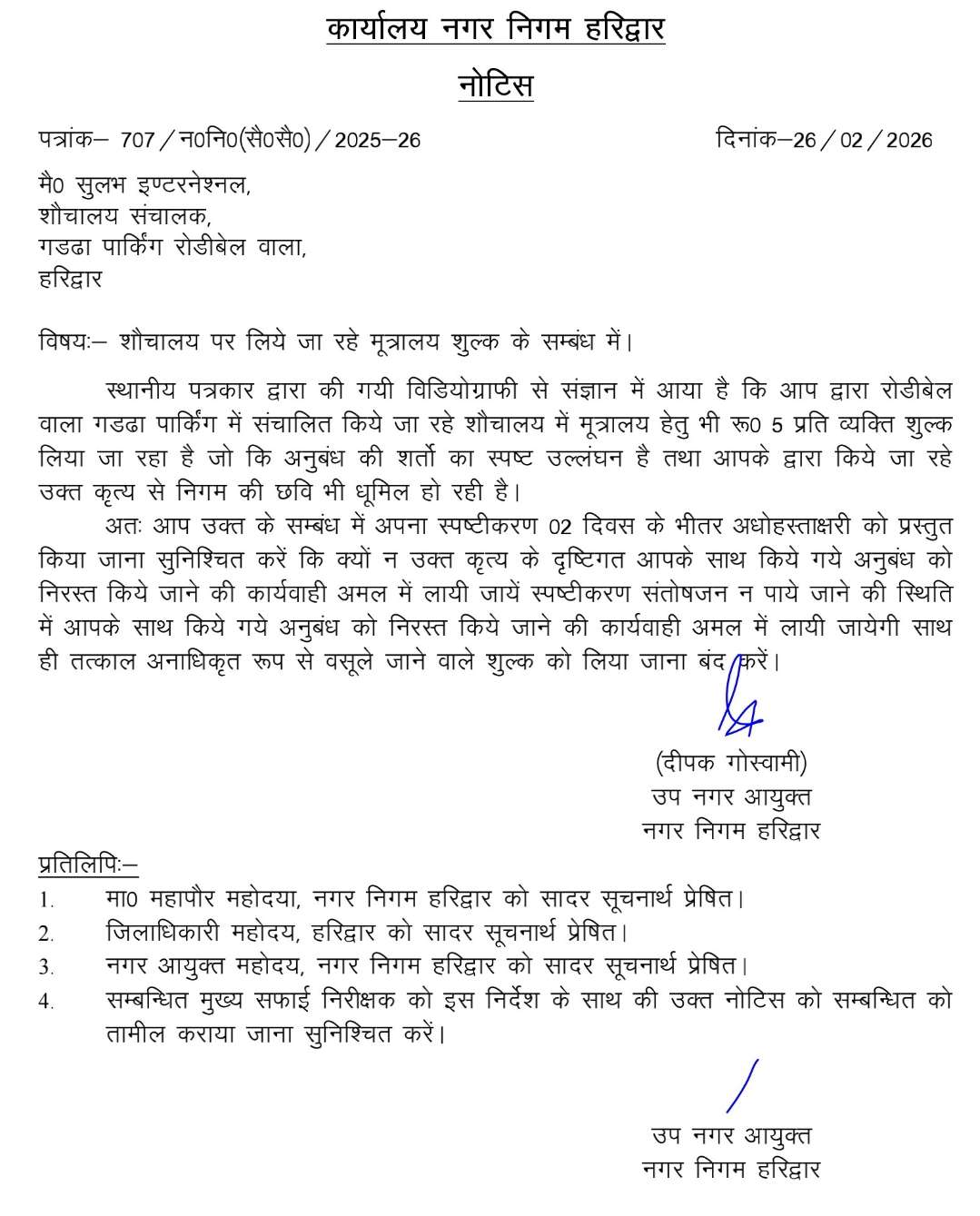 नगर निगम हरिद्वार द्वारा शहर में संचालित सभी अनुबंधित सार्वजनिक शौचालयों को भी सख्त निर्देश जारी किए गए हैं कि यूरिनल उपयोग के लिए किसी भी व्यक्ति से किसी प्रकार का शुल्क न लिया जाए। निर्देशों का उल्लंघन पाए जाने पर संबंधित संचालकों के विरुद्ध कठोर कार्रवाई अमल में लाई जाएगी।