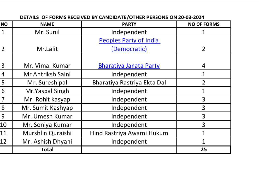 हरिद्वार। जिला निर्वाचन कार्यालय से मिली जानकारी के अनुसार आज कलेक्ट्रेट रोशनाबाद में रिटर्निंग ऑफिसर कार्यालय से आज पीपुल्स पार्टी ऑफ इंडिया (डेमोक्रेटिक) के ललित ने दो, बीजेपी से (त्रिवेंद्र सिंह रावत के प्रतिनिधि) विमल कुमार ने 4 सेट,हिन्द राष्ट्रीय अवामी हुकम के मुर्सलीन कुरेशी ने एक, भारतीय राष्ट्रीय एकता दल से सुरेश पाल ने दो, निर्दलियों में अंतरिक्ष सैनी के प्रतिनिधि ने एक, यशमोद सिंह ने एक, रोहित कश्यप ने तीन, सुमित कश्यप ने तीन, उमेश कुमार ने तीन, एस कुमार ने तीन, सुनील ने एक, आशीष ध्यानी ने एक फार्म लिया।